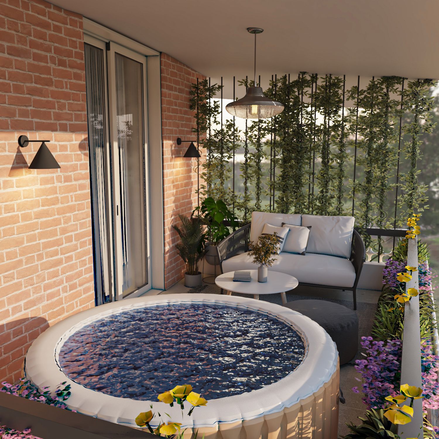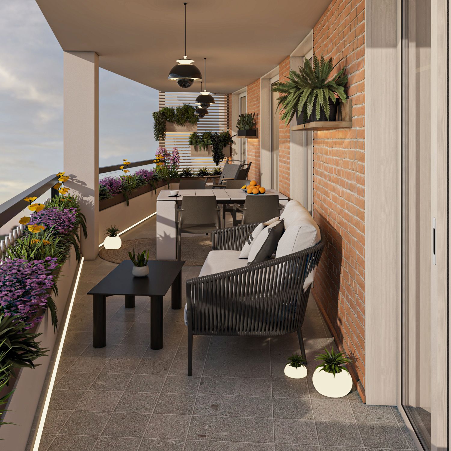 The terrace was transformed into a vibrant, interactive zone with a cozy sofa, extendable dining table for guests, and lush greenery around the perimeter to bring nature into the design.