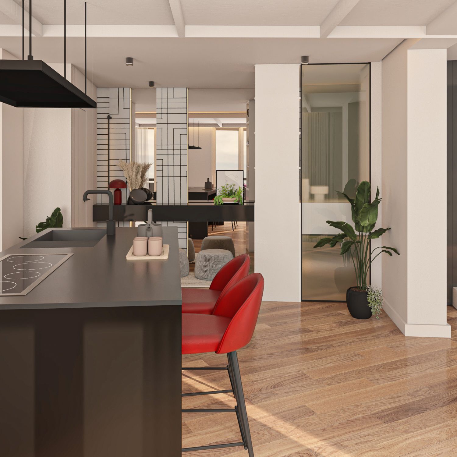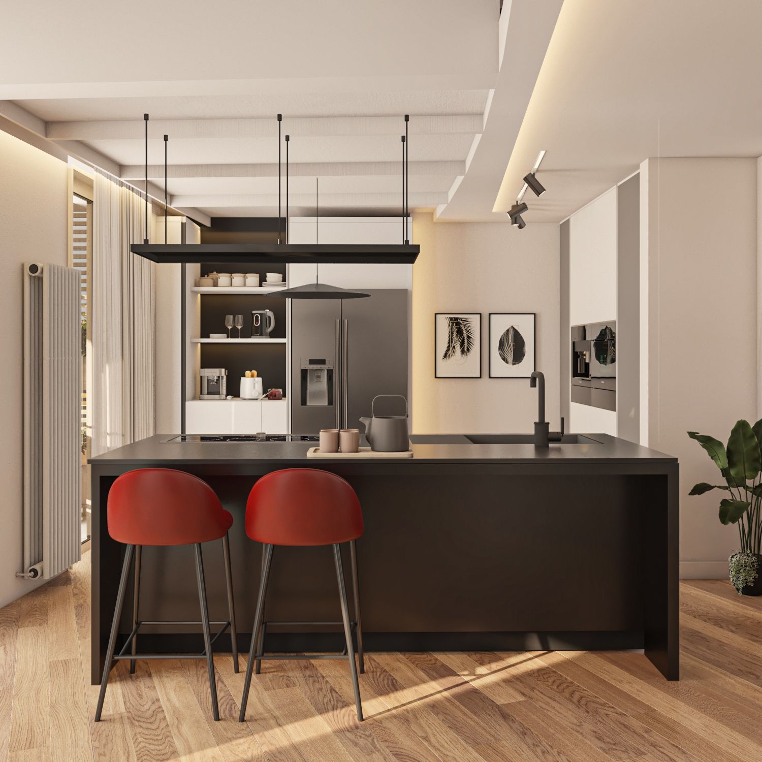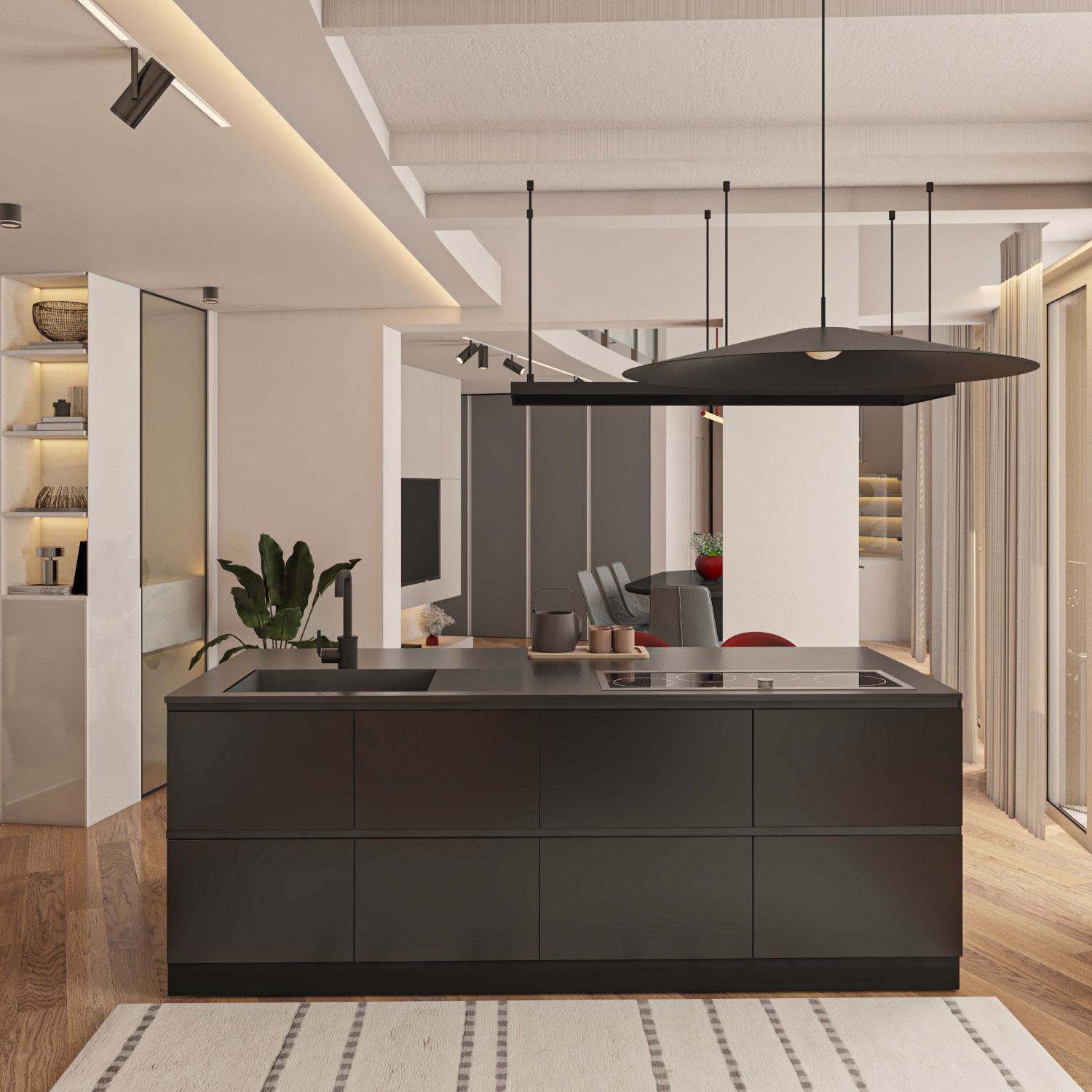 -We preserved the existing kitchen and added a custom cabinet with a built-in fridge and coffee corner, complemented by soft lighting, decorative wall art, and subtle color accents.