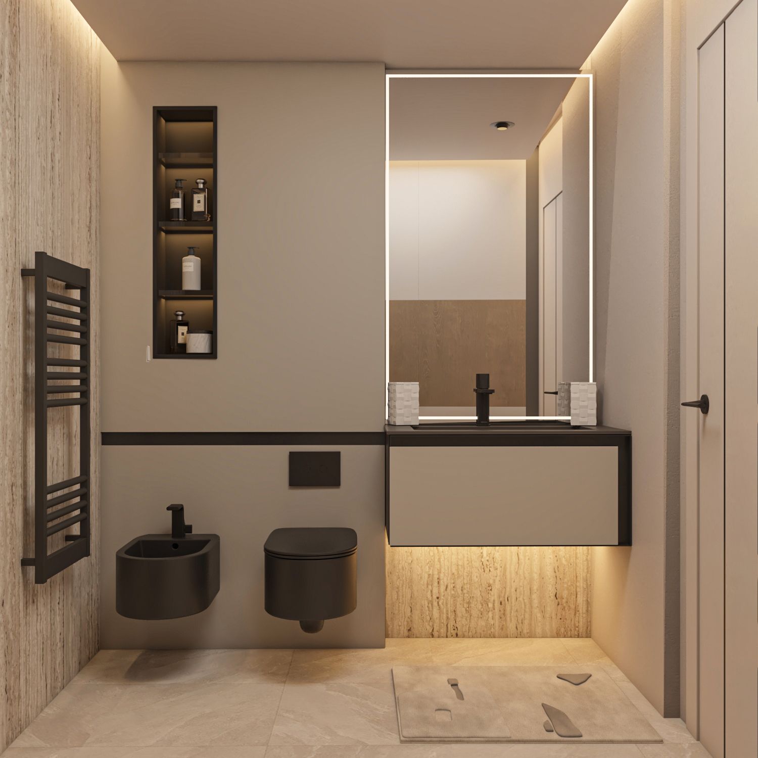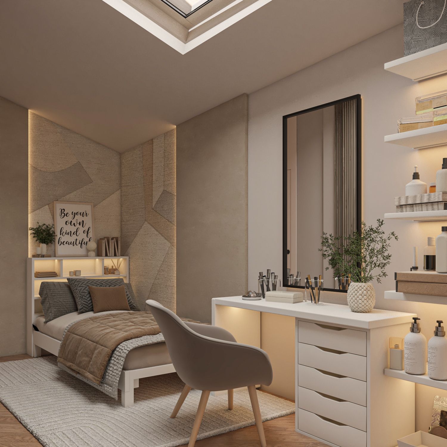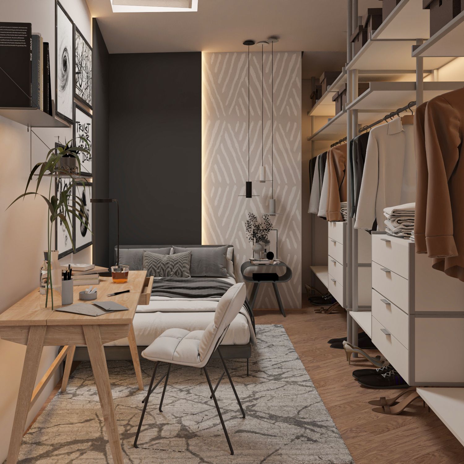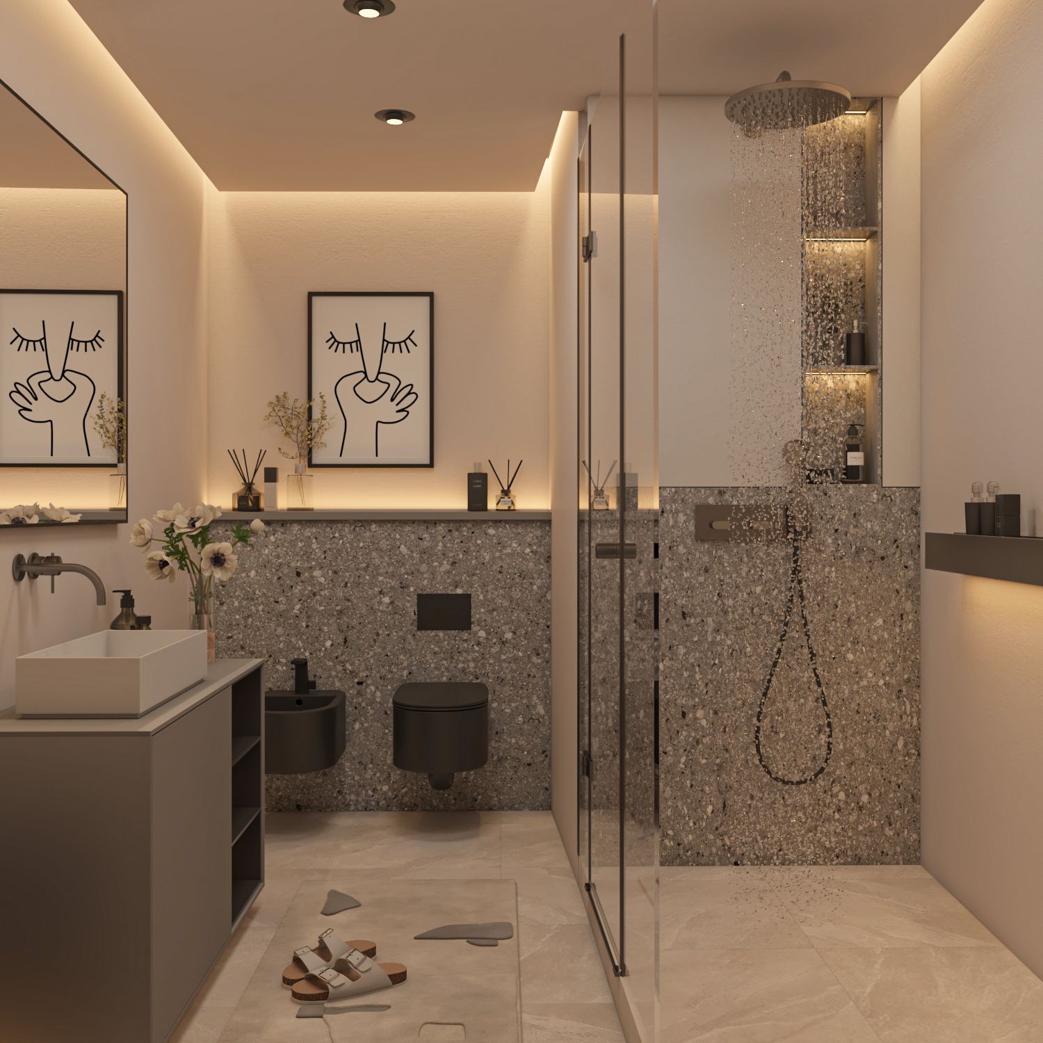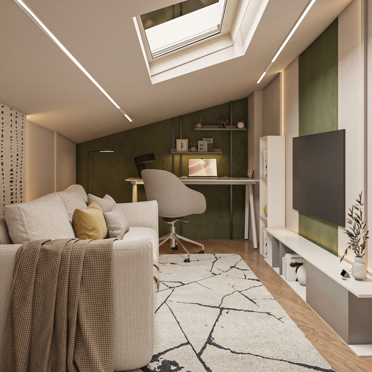 _Questa casa su due piani è stata progettata per combinare eleganza moderna e comfort, creando uno spazio abitativo sereno e funzionale. _Quarto piano Il layout comprende una cucina, una zona pranzo, due bagni e una terrazza. -Abbiamo mantenuto la cucina esistente e aggiunto un mobile su misura con frigorifero integrato e angolo caffè, completato da illuminazione soffusa, opere d'arte decorative sulle pareti e accenti di colore delicati. -Nella zona pranzo è stata introdotta una parete TV per dare energia allo spazio, insieme a ripiani moderni in un tono fresco e contemporaneo. La terrazza è stata trasformata in un'area vivace e interattiva con un divano accogliente, un tavolo da pranzo estensibile per gli ospiti e una rigogliosa vegetazione lungo il perimetro per portare la natura nel design. _Piano superiore Originariamente con due camere da letto (matrimoniale e singola), abbiamo ampliato il layout per includere una terza stanza aggiungendo una parete divisoria. -La nuova stanza funge da spazio flessibile per lavoro leggero e stiratura, con un divano letto per ospitare gli ospiti.