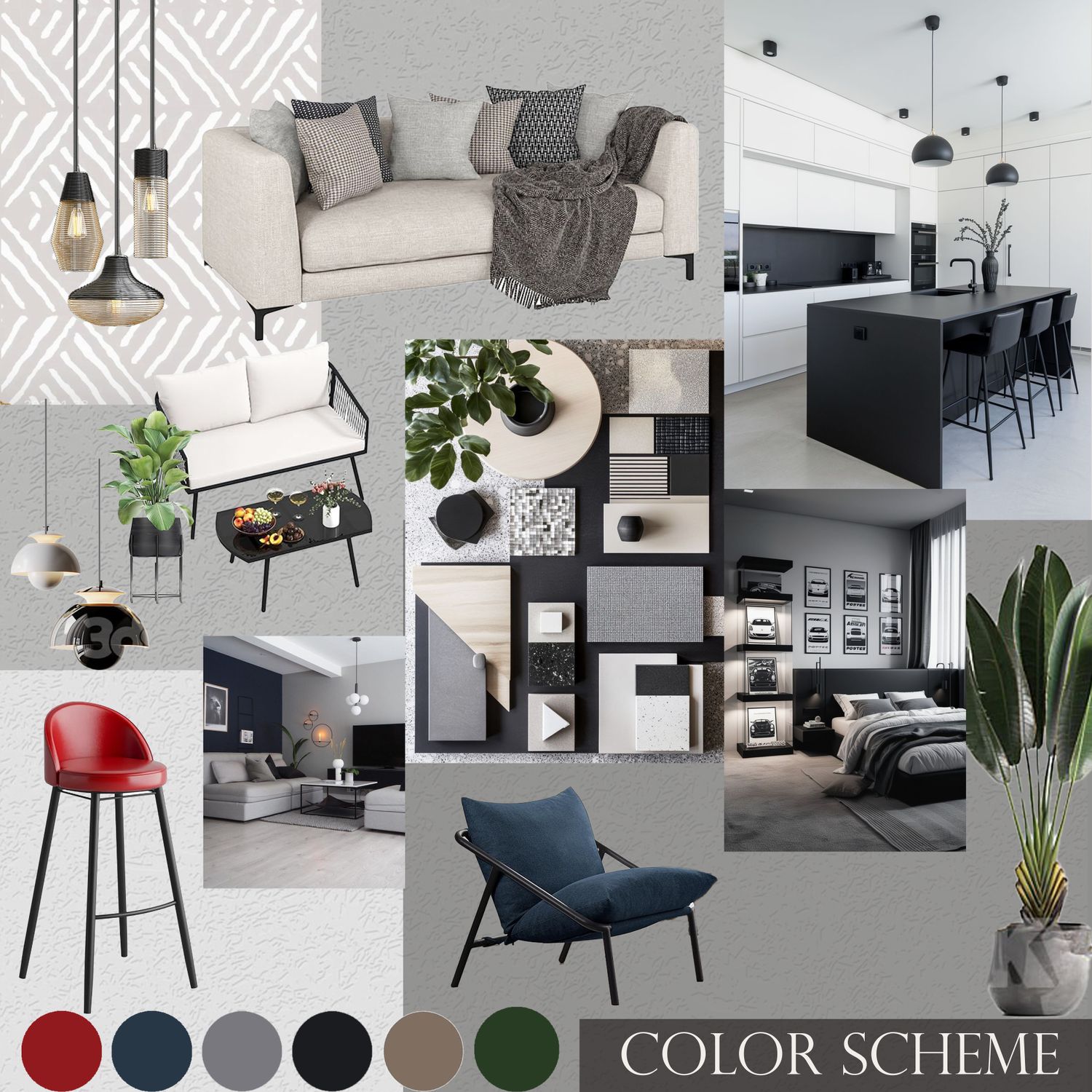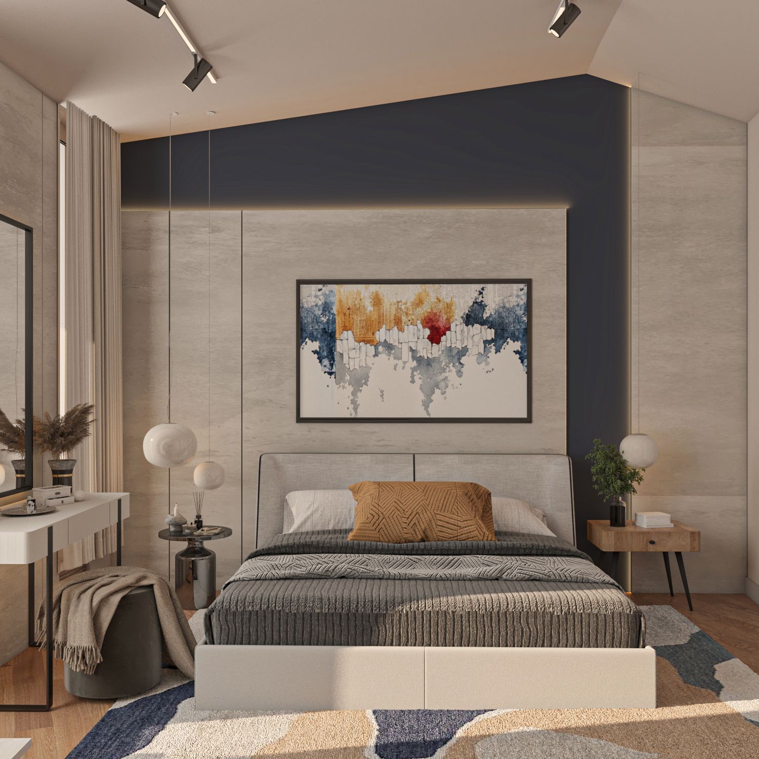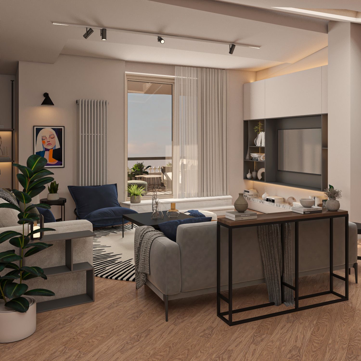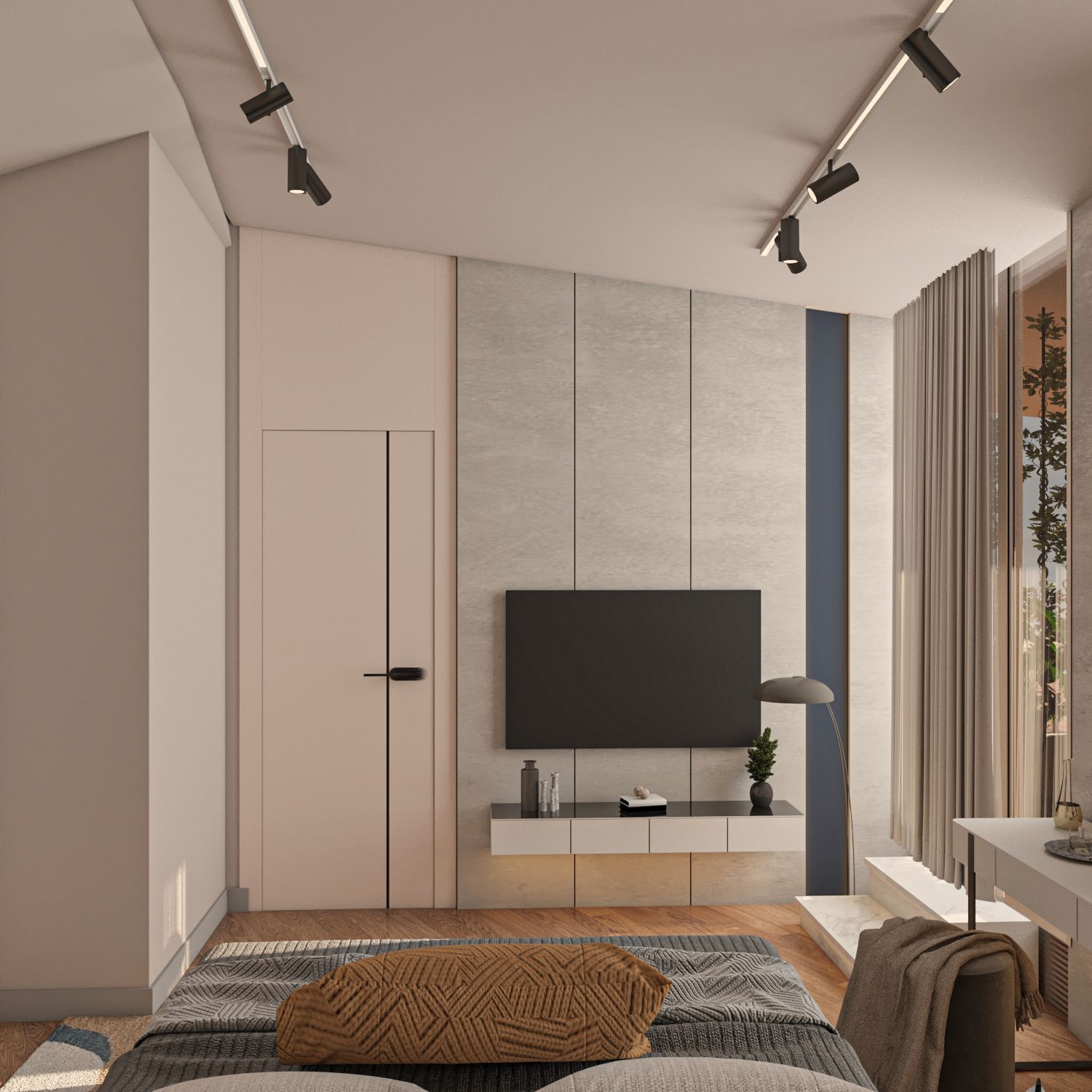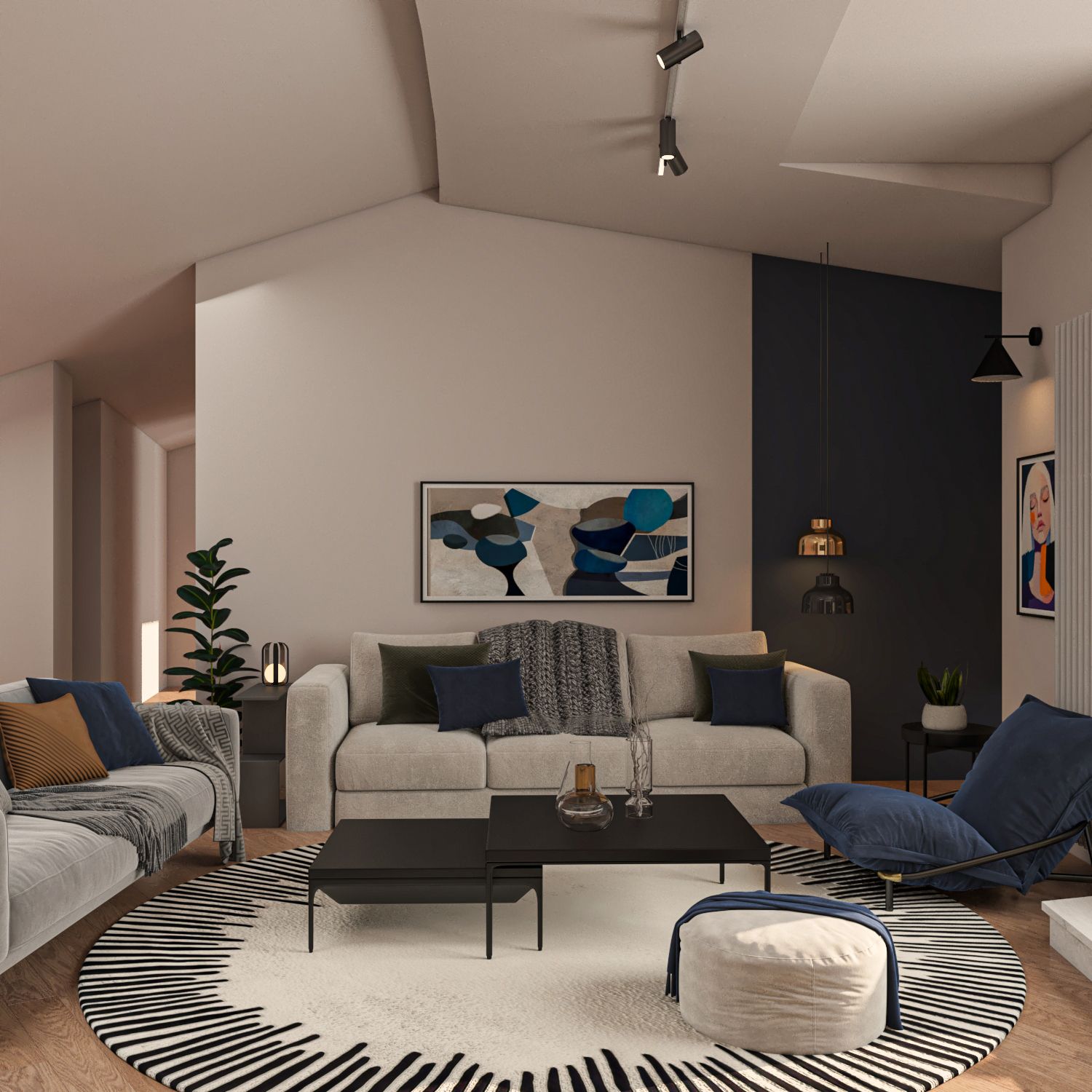 -The central lounge was designed as a family relaxation area, featuring multiple sofas and a TV wall for evening gatherings. A deep navy accent wall adds both Elegance and warmth. -This lounge opens onto an upper terrace, furnished with a small bar and sofa, surrounded by greenery for a serene retreat. -Each room on the upper floor carries its own color identity, enhanced with wallpaper, hidden lighting, and warm fixtures to create a rich, harmonious atmosphere. In contrast, the ground floor follows a unified color palette to suit its open layout. _This home was thoughtfully designed to offer modern living with a calm ambiance, where every furnishing was selected for comfort, style, and ease of use.