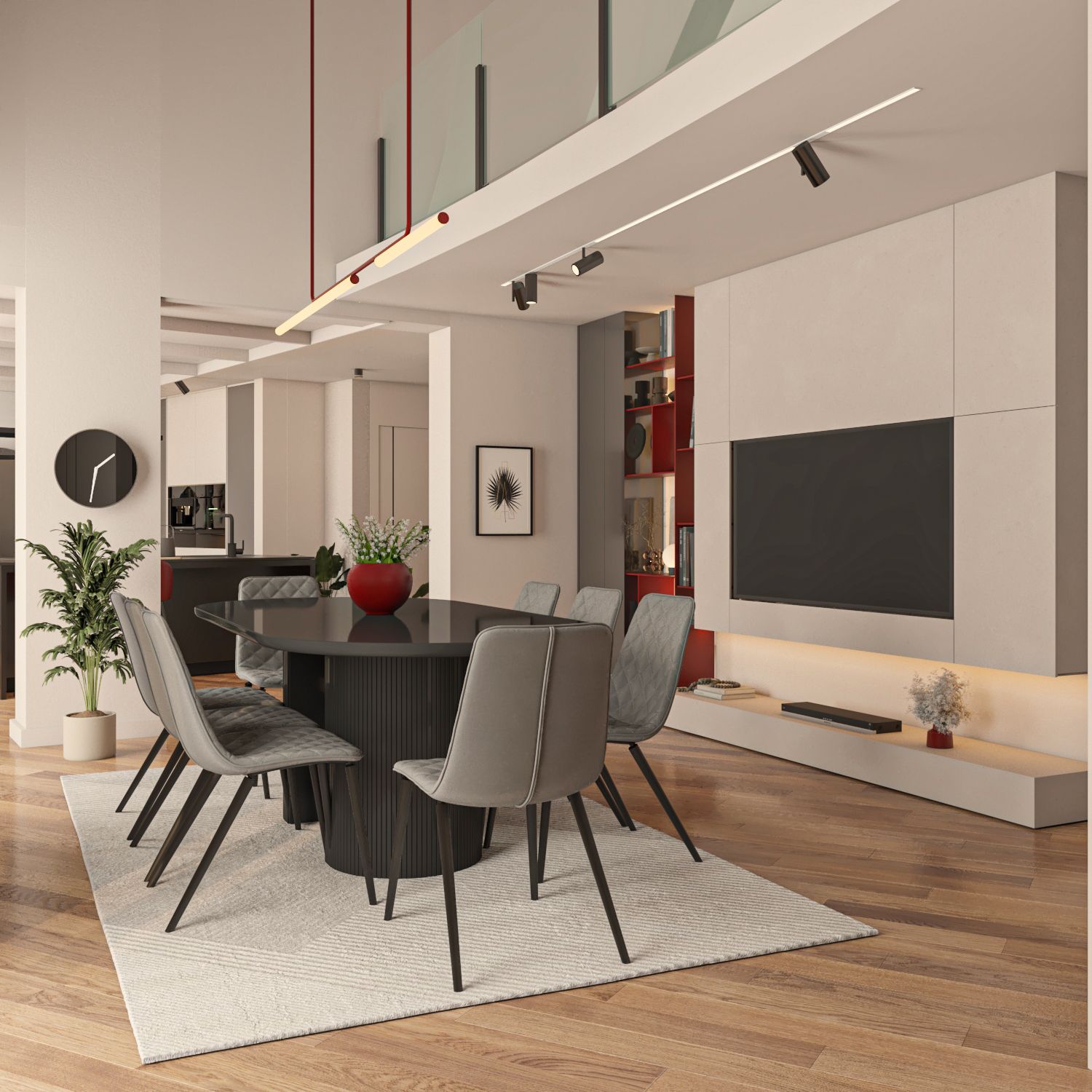 -In the dining area, a TV wall was introduced to energize the space, along with modern shelving in a fresh, contemporary tone.