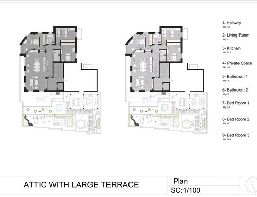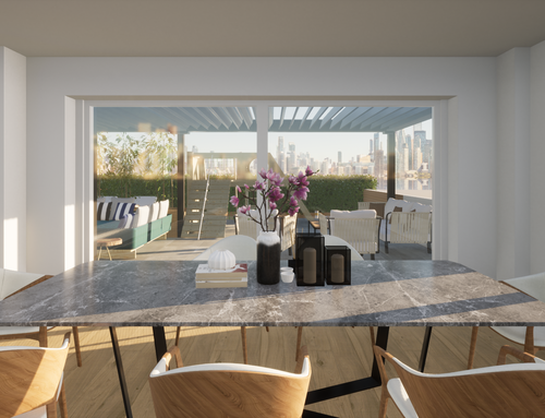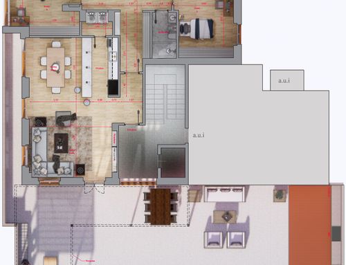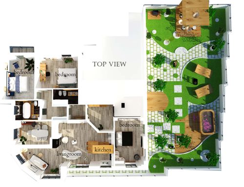 Richiedo 4 viste render. 2 in soggiorno (a contrasto) e 2 in terrazzo oltre alla pianta 3D (in sbieco) (vedi esempio allegato) vista di sbieco e non in verticale. Quest'ultima senza fondo perimetrale all'immagine stessa.