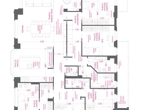 The need is to have 1 master bedroom with bathroom, possibly walk-in closet, 2 single bedrooms, second bathroom and possibly room with bathroom for housekeeper. Like the modern style, current height is 280 cm from which you have to make the floors with radiant heating.