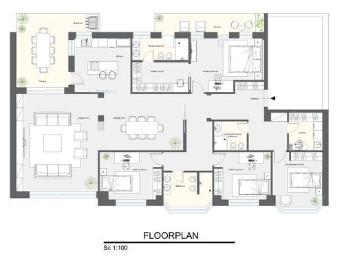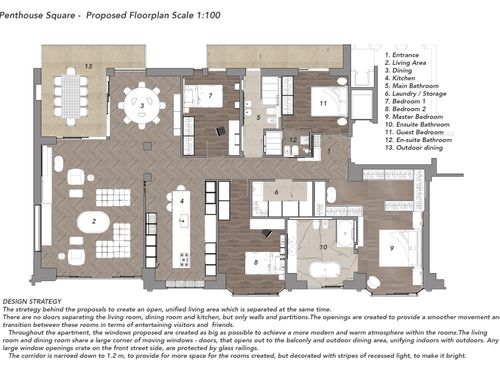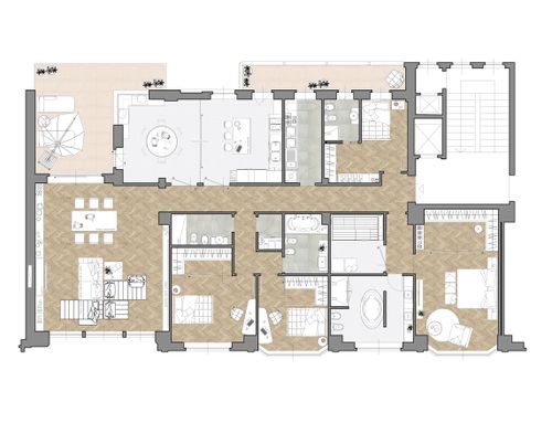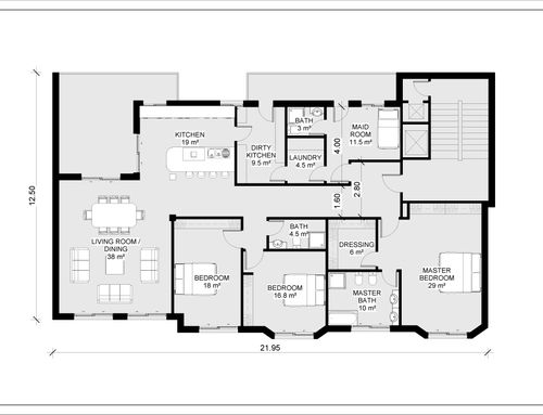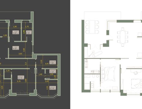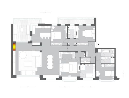 The intervention must reduce the current corridor, which is too large and does not create harmony of the spaces. The living area is linked to the main terrace so it is likely to remain as it is now. The living room likes to become open space with the dining area, separate kitchen, laundry area with service.