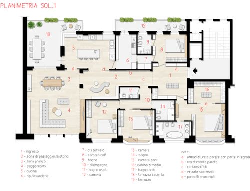 L’esigenza è di avere 1 camera padronale con bagno eventuale cabina armadio, 2 camere singole, secondo bagno ed eventuale stanza con bagno per governante. Piace lo stile moderno, altezza attuale è di 280 cm dal quale bisogna fare i pavimenti con riscaldamento radiante.