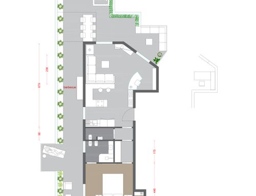 - Mostrador orientado hacia el televisor en la sala de estar, para que pueda verse incluso durante las comidas (no hay mesa de comedor, que en su lugar debe proporcionarse en la terraza)