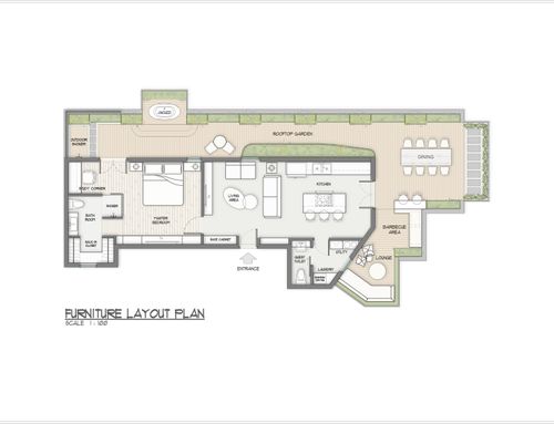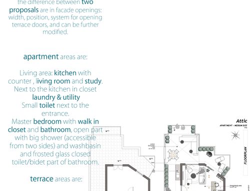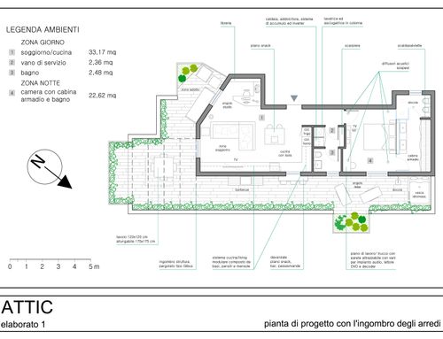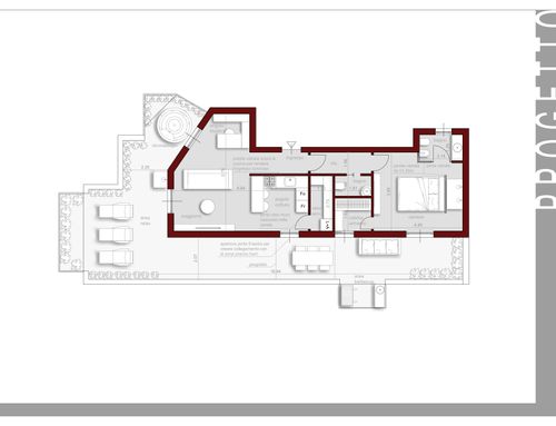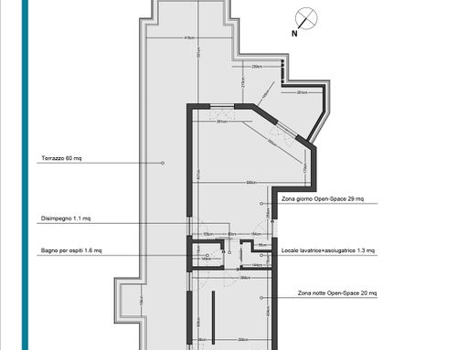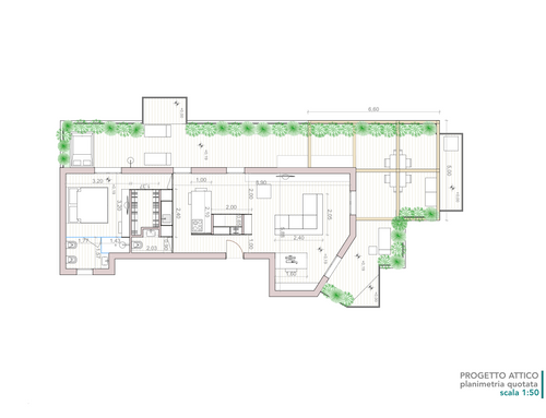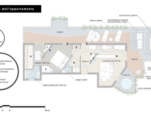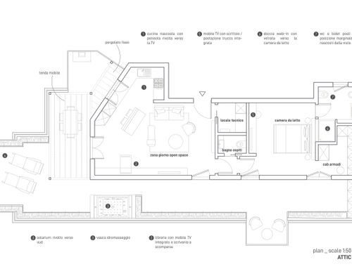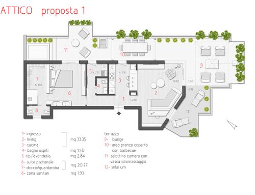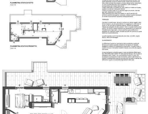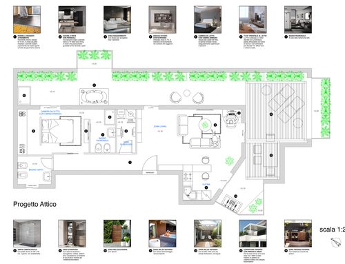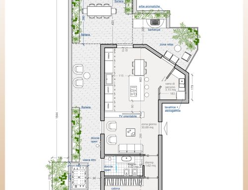 Trattandosi di un attico, una particolare cura progettuale dovrà essere dedicata anche al terrazzo, che dovrà rappresentare un valore aggiunto ed essere visto come un prolungamento della abitazione.