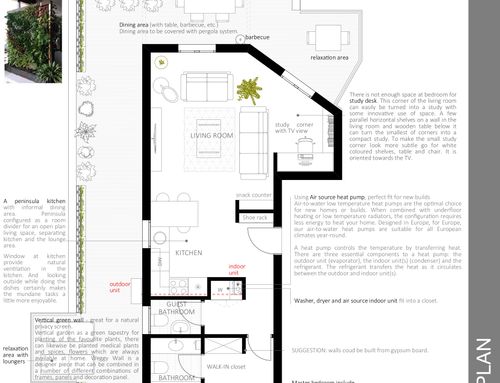 - Study corner with a small desk that fits nicely into the day context, always oriented towards the TV (possibly the small study area can also be provided in the sleeping area)