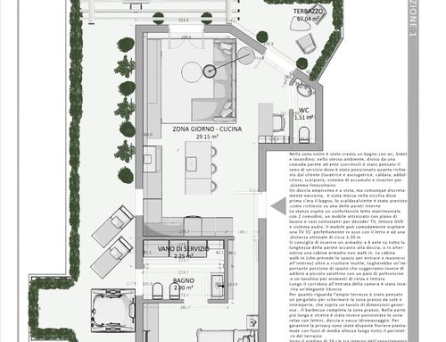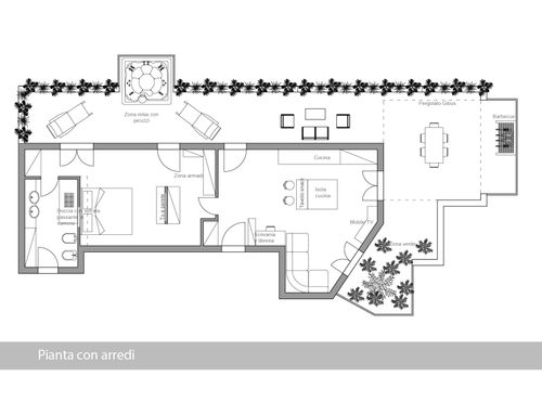 Il perimetro del terrazzo, dovrà essere opportunamente piantumato al fine di preservare la giusta privacy in particolar modo nella zona relax.