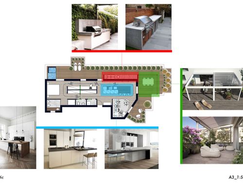 You want to provide a dining area (with table, barbecue, etc. etc.) and a relaxation area with loungers, outdoor shower and Jacuzzi.