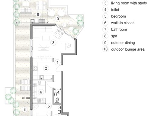 Dado que es un ático, también se debe dedicar un cuidado de diseño particular a la terraza, que debe representar un valor agregado y verse como una extensión del hogar.