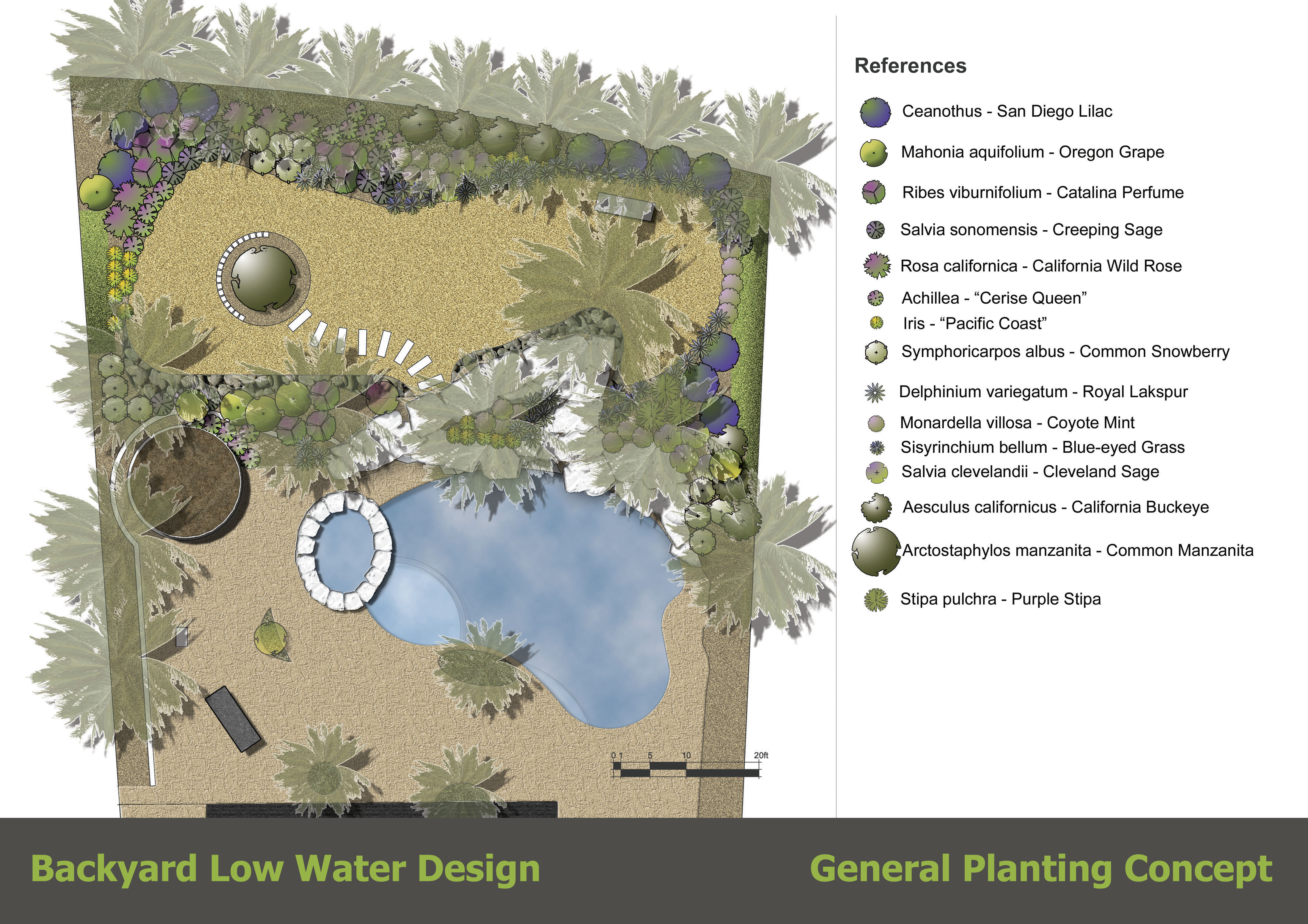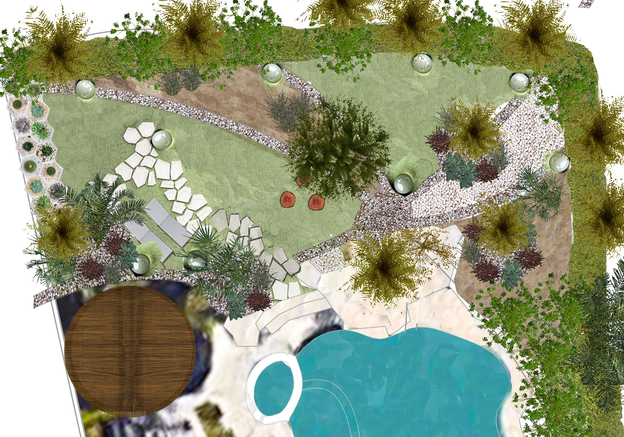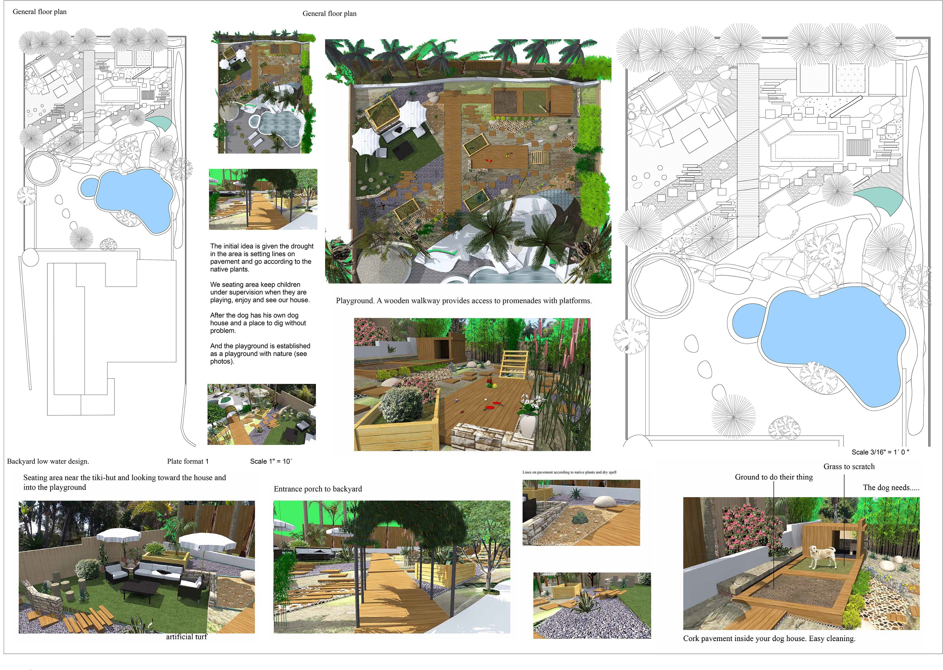 Looking for designs for a nice backyard area in our upper lot to replace currently dead lawn area. Note that southern California is in an extreme drought so lawn is not an option. We need drought tolerant, native plants. The tricky thing here is that I have a large dog and 2 small kids and I'd like the area to be appealing to both. The dog needs a place to go to the bathroom and the kids want a place to play. I'd also like some sort of seating area, a small amount of artificial lawn maybe, and a dry creek bed. I'm not looking to change the actual structures that are already in place, ie the walls, the tiki hut, the pool, spa etc are all good as is along with the large palms and I would like to keep many of the existing large plants and all of the current cement walkways etc. I am open to getting rid of the pink and yellow trees but I am happy with the palms. The kids are 2 and 6 and the dog is a golden retriever.