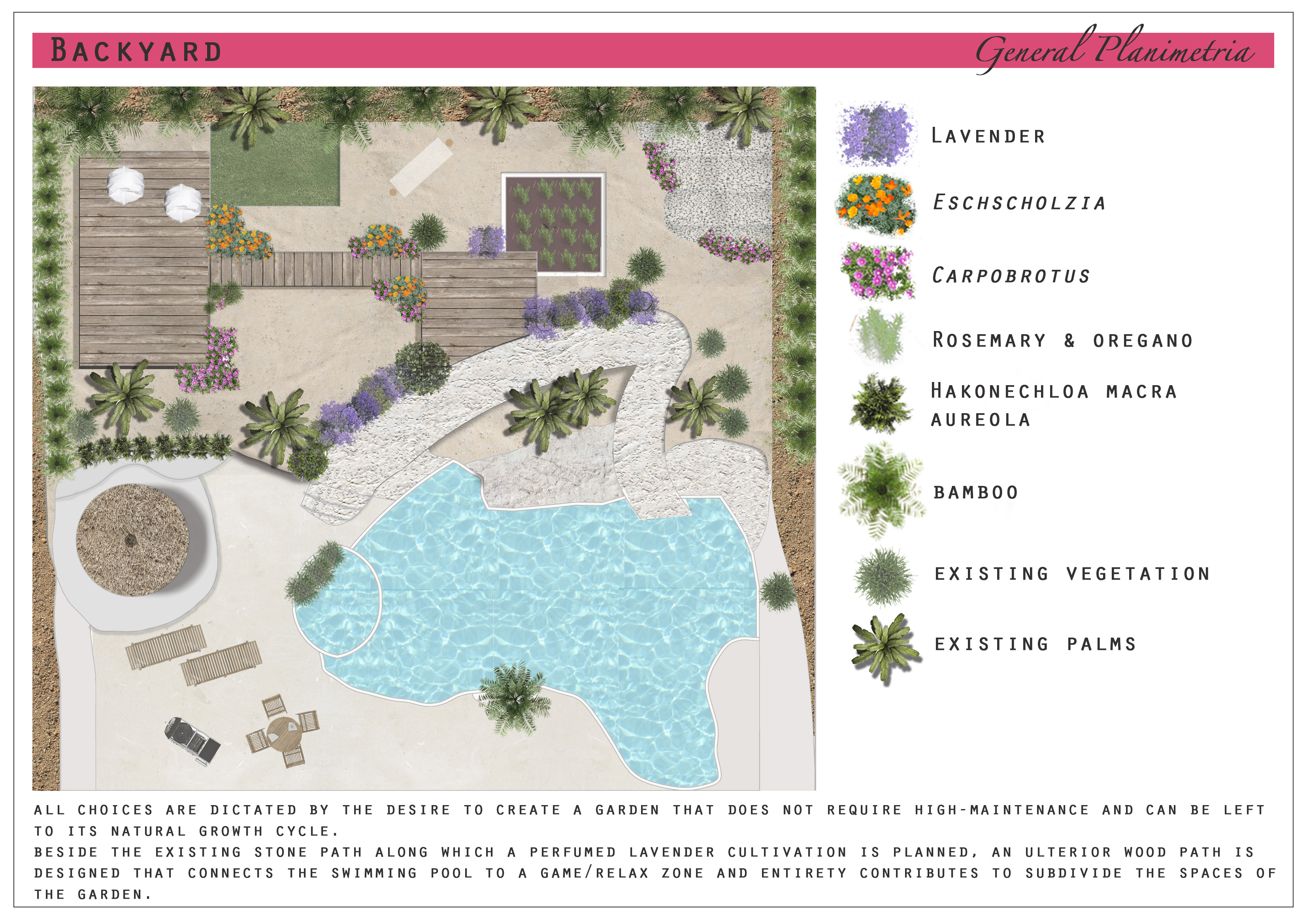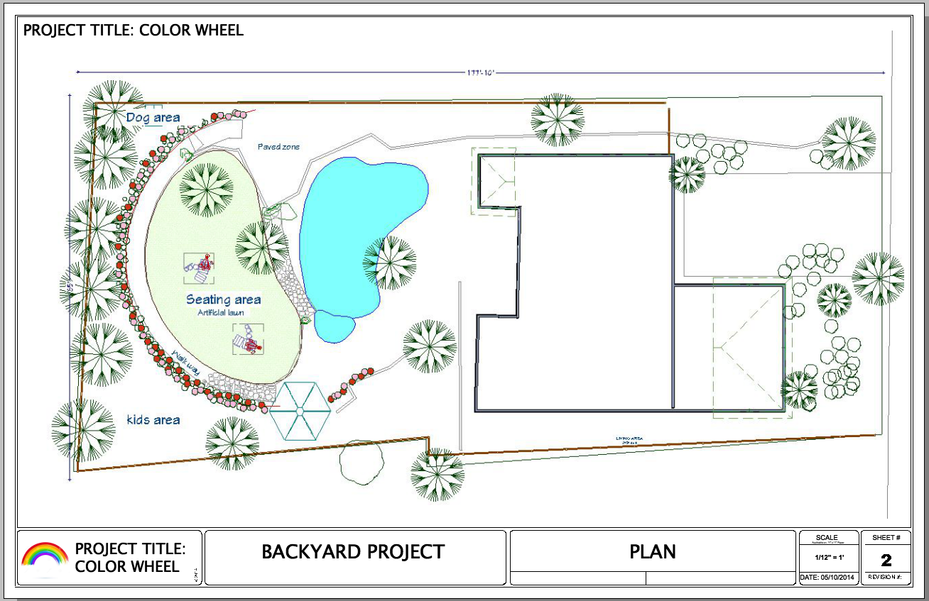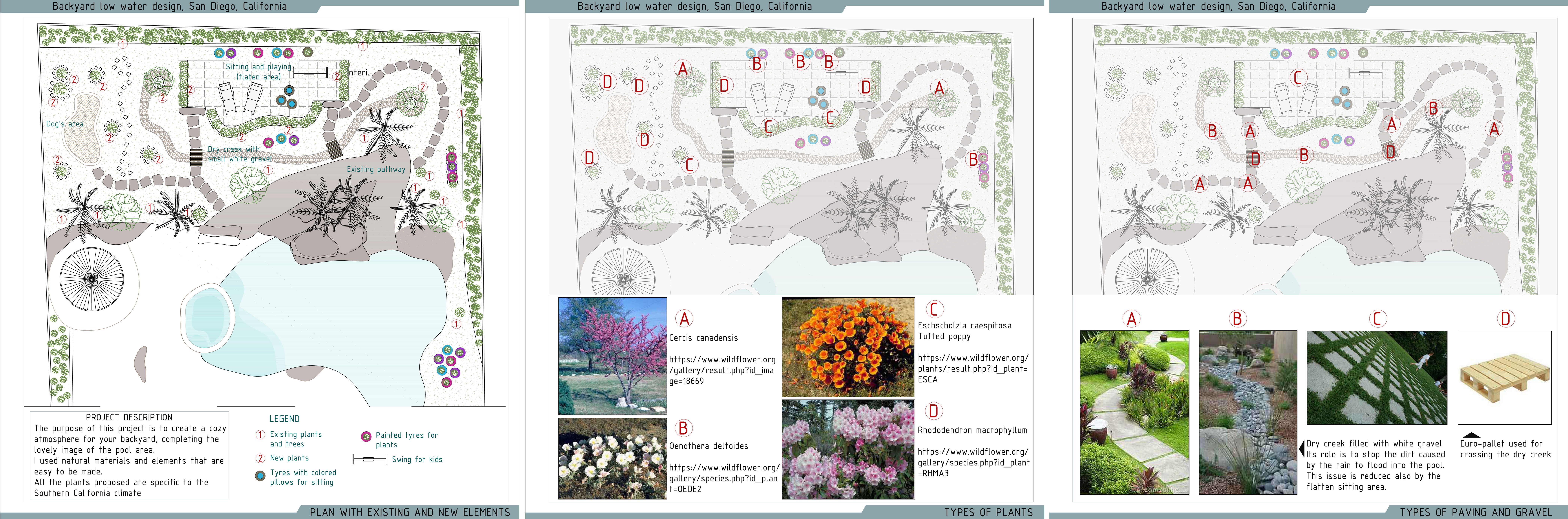 Looking for designs for a nice backyard area in our upper lot to replace currently dead lawn area. Note that southern California is in an extreme drought so lawn is not an option. We need drought tolerant, native plants. The tricky thing here is that I have a large dog and 2 small kids and I'd like the area to be appealing to both. The dog needs a place to go to the bathroom and the kids want a place to play. I'd also like some sort of seating area, a small amount of artificial lawn maybe, and a dry creek bed. I'm not looking to change the actual structures that are already in place, ie the walls, the tiki hut, the pool, spa etc are all good as is along with the large palms and I would like to keep many of the existing large plants and all of the current cement walkways etc. I am open to getting rid of the pink and yellow trees but I am happy with the palms. The kids are 2 and 6 and the dog is a golden retriever.