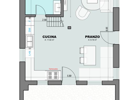 Sono vincolate le posizioni del WC per lo scarico, circa la posizione della termocucina per il camino in angolo la quale è comoda anche per cucinare..