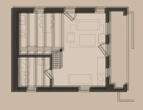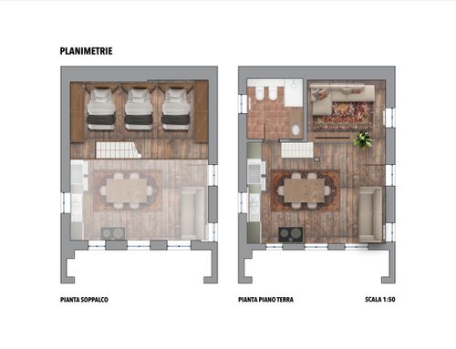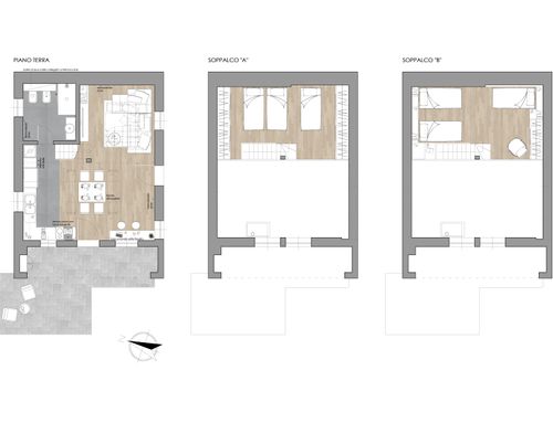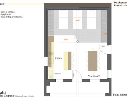 Il soppalco è pensato come zona letto, ma essendo molto basso, è previsto solo il posizionamento dei letti. Si dovrà installare una protezione dalla caduta fatta in struttura leggera e/o poco invadente.