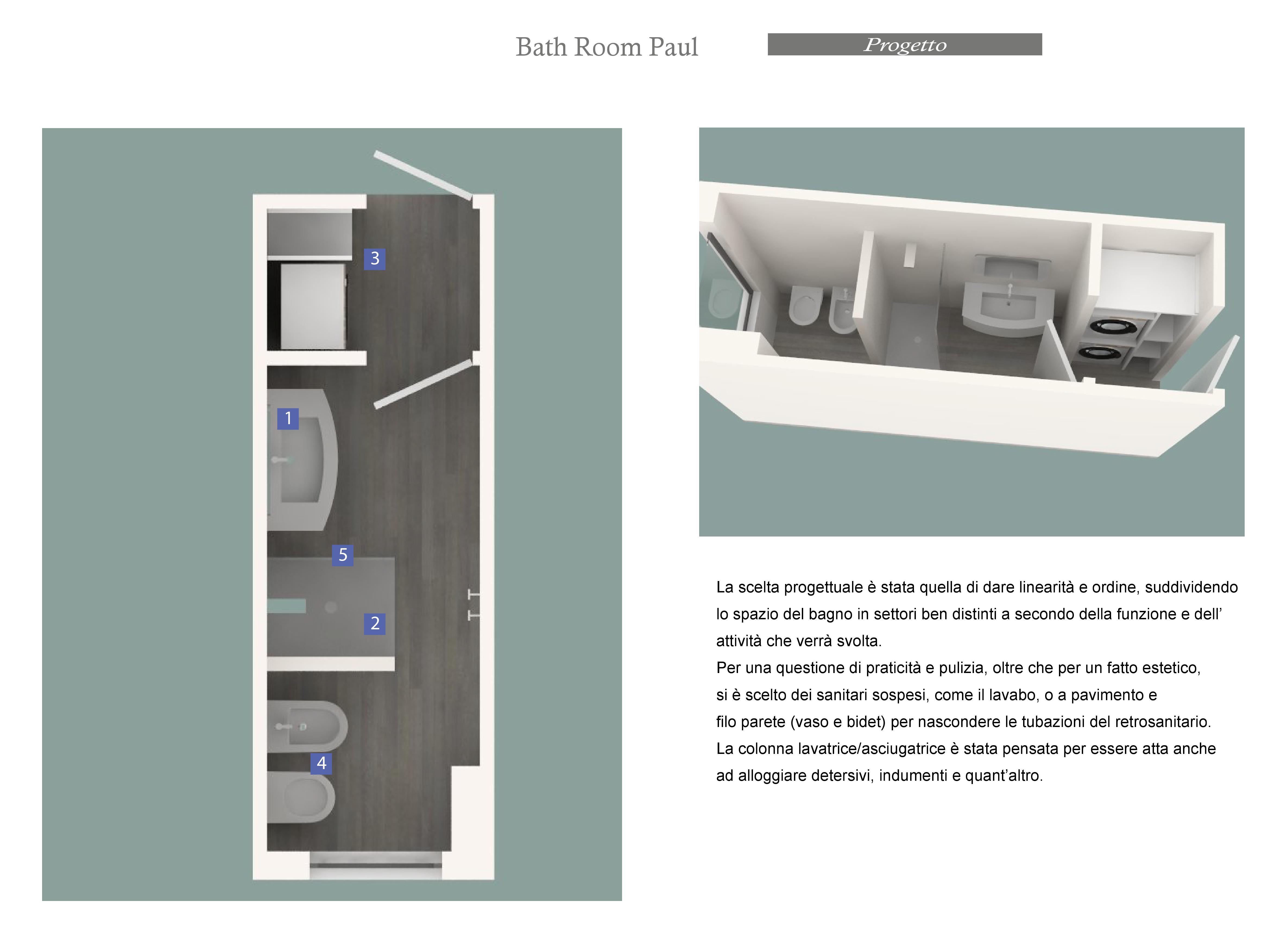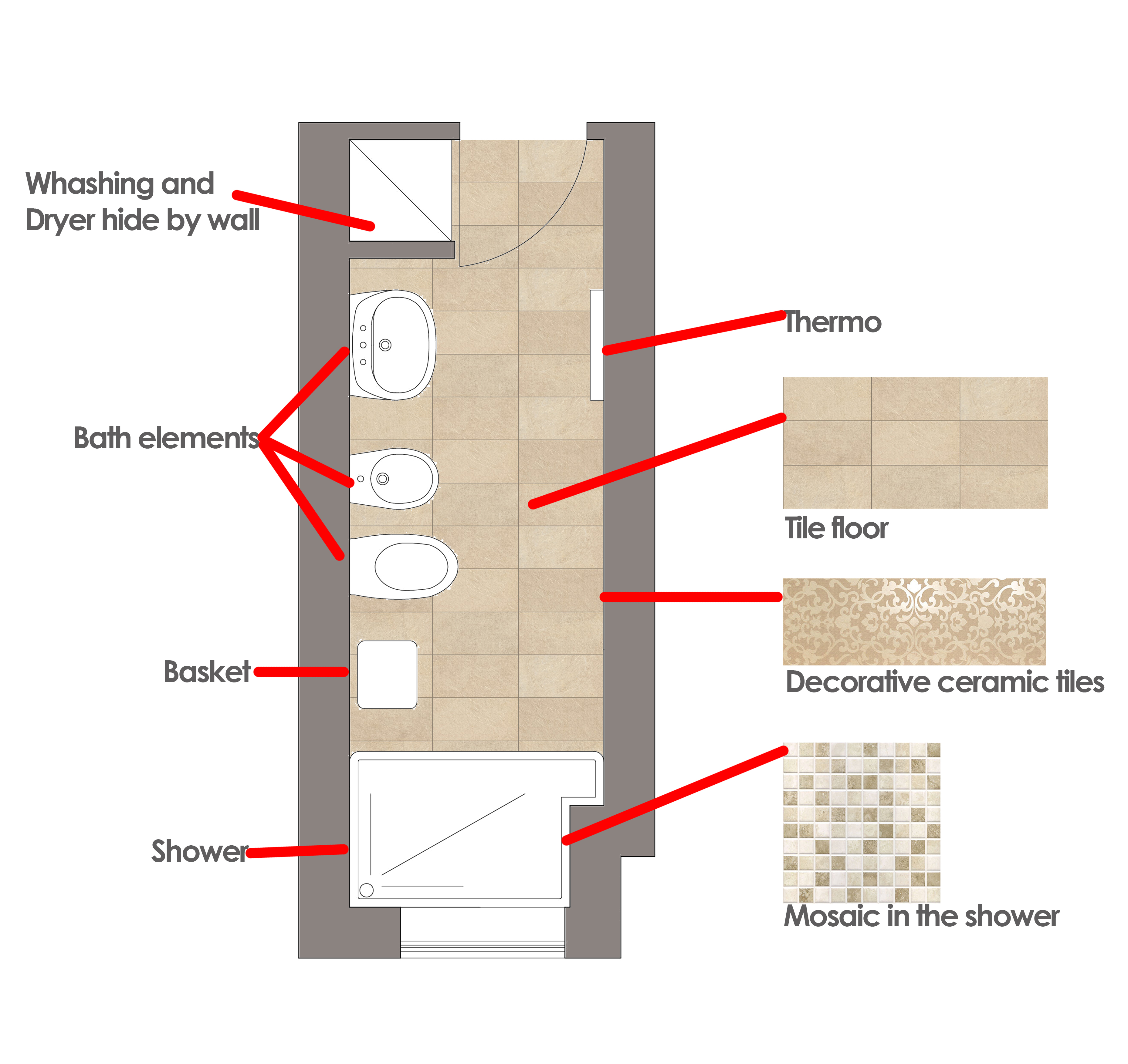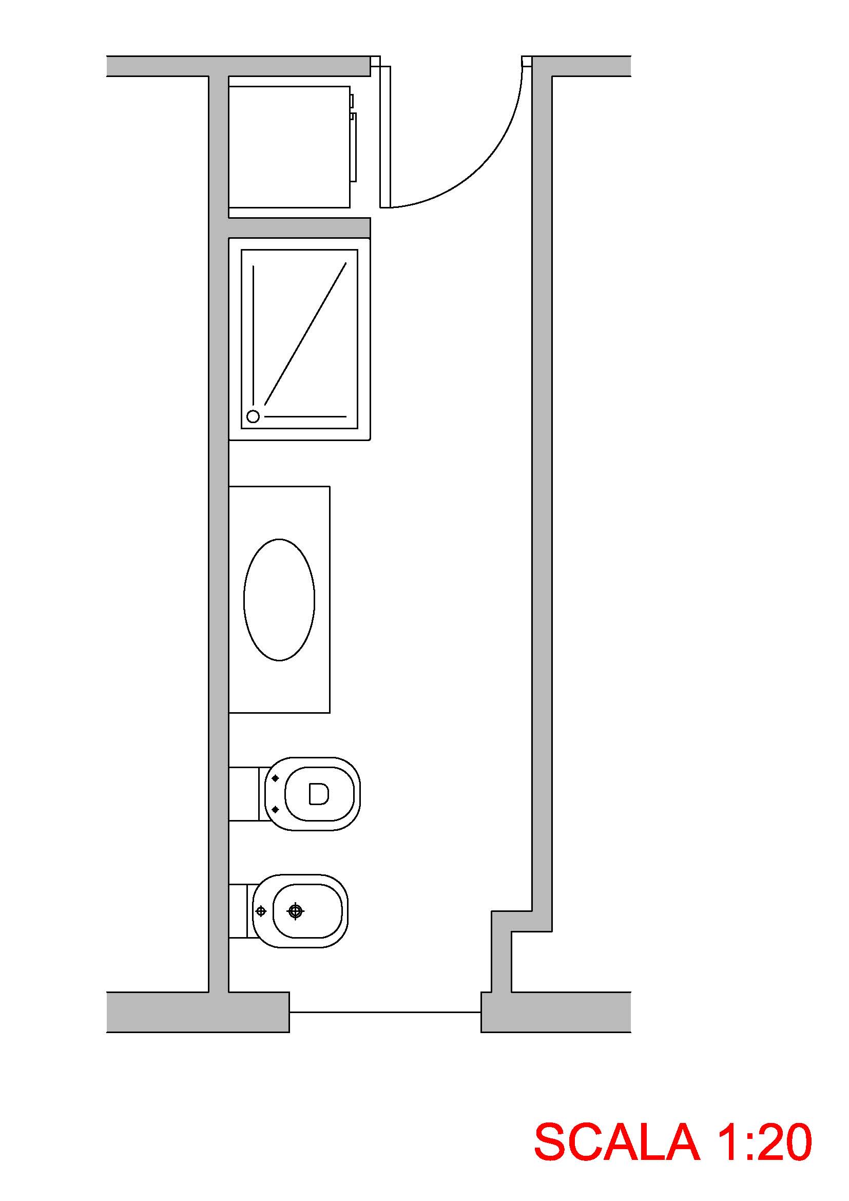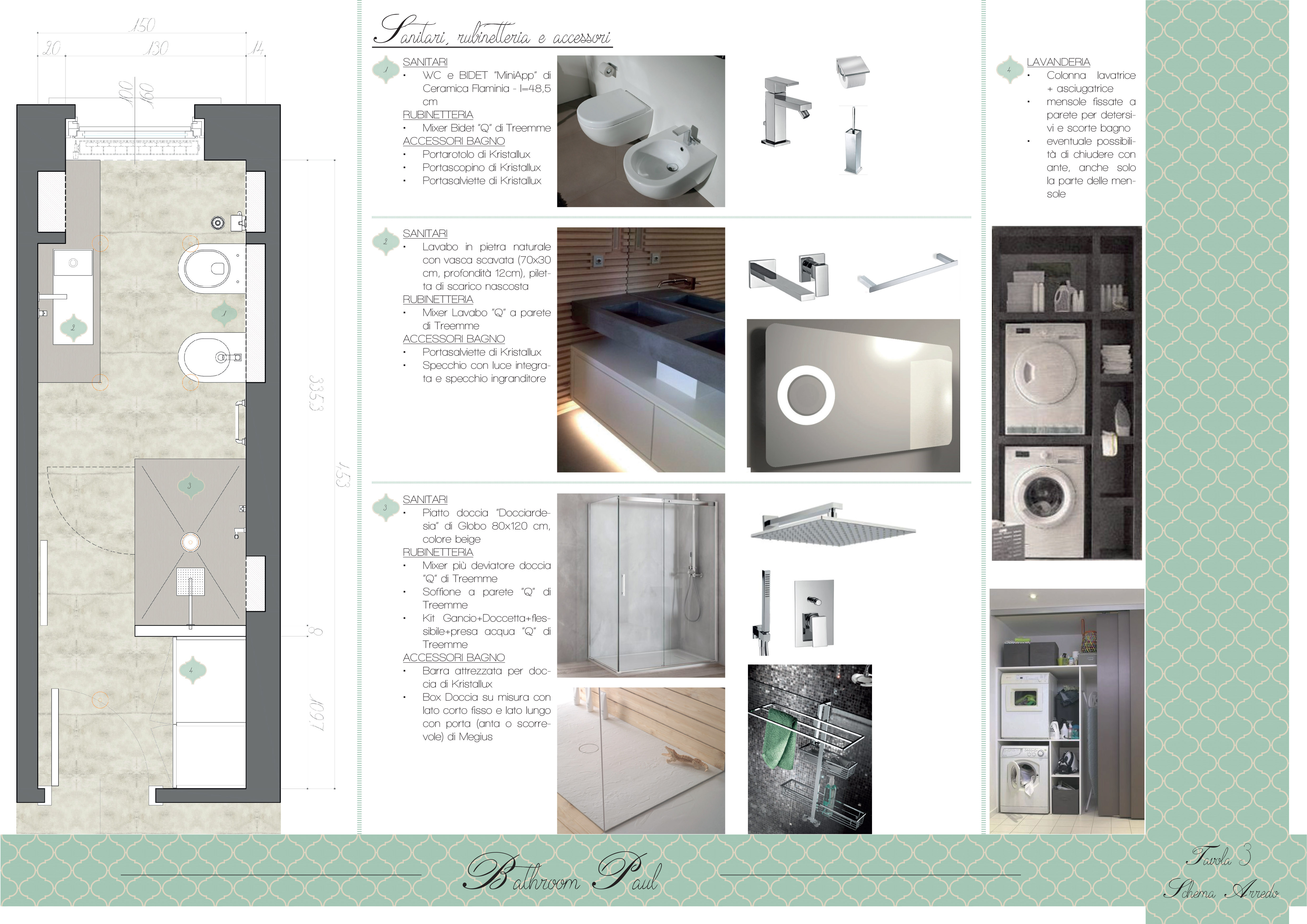 Il bagno dovrà avere i seguenti accessori: Bidet WC Doccia Lavabo Colonna lavatrice/asciugatrice Non dovrà avere la vasca