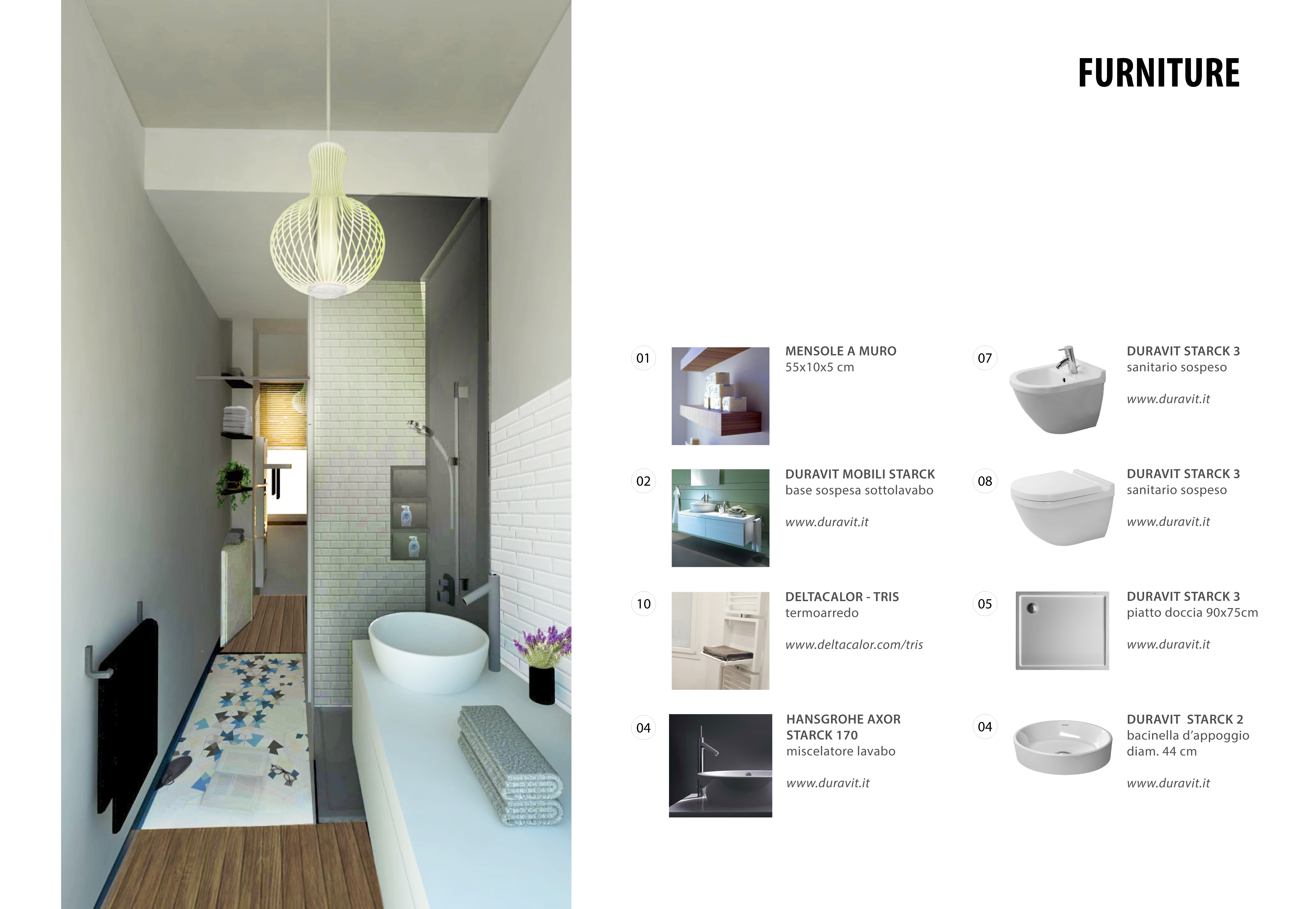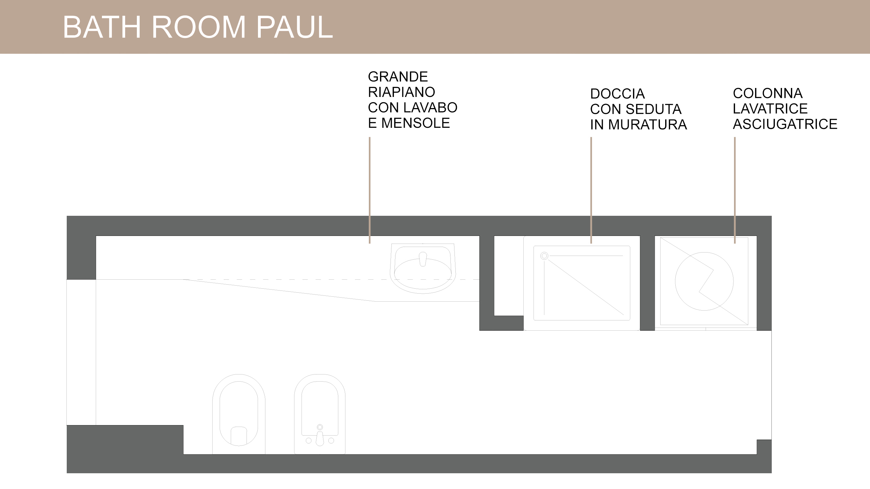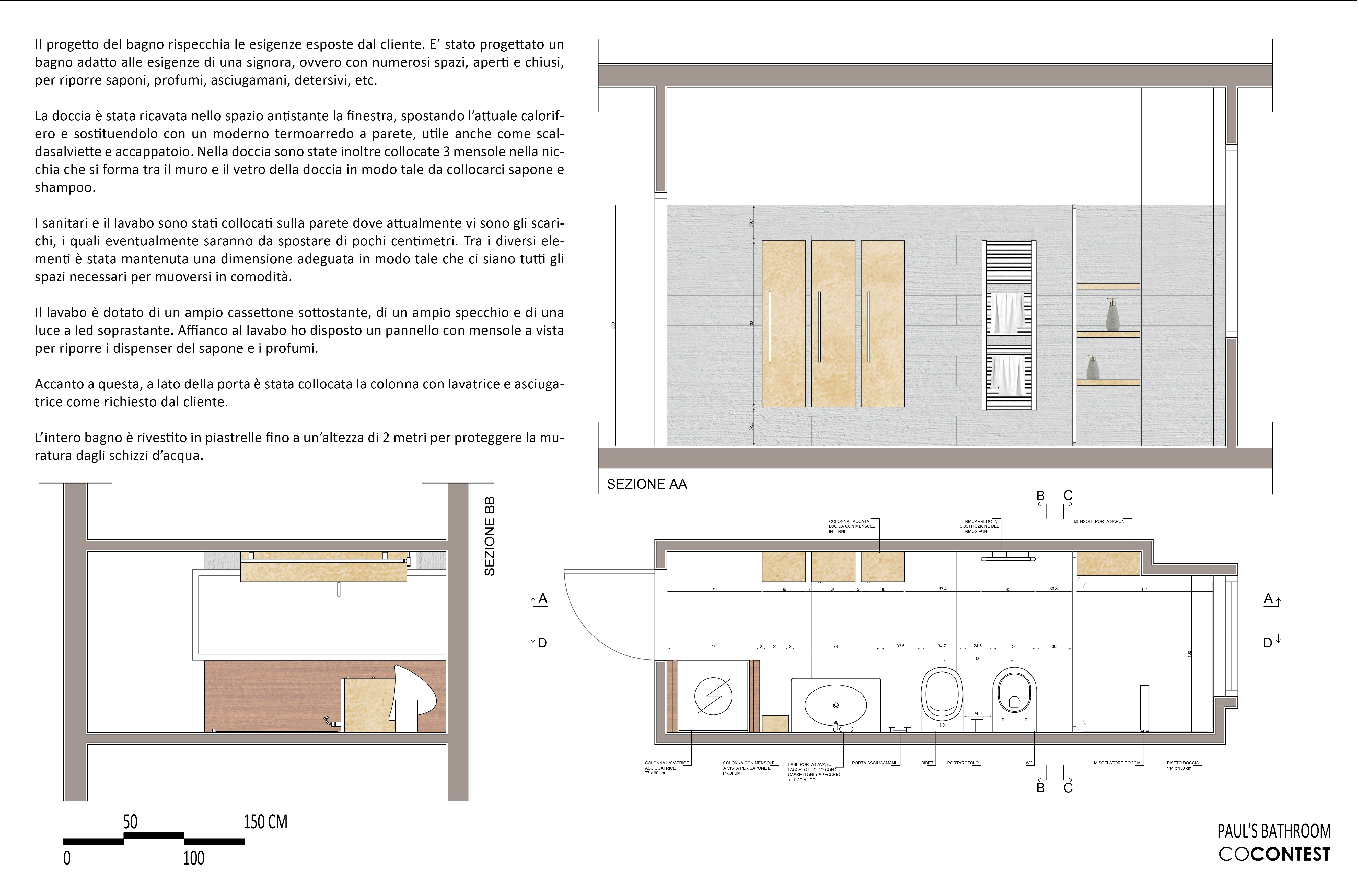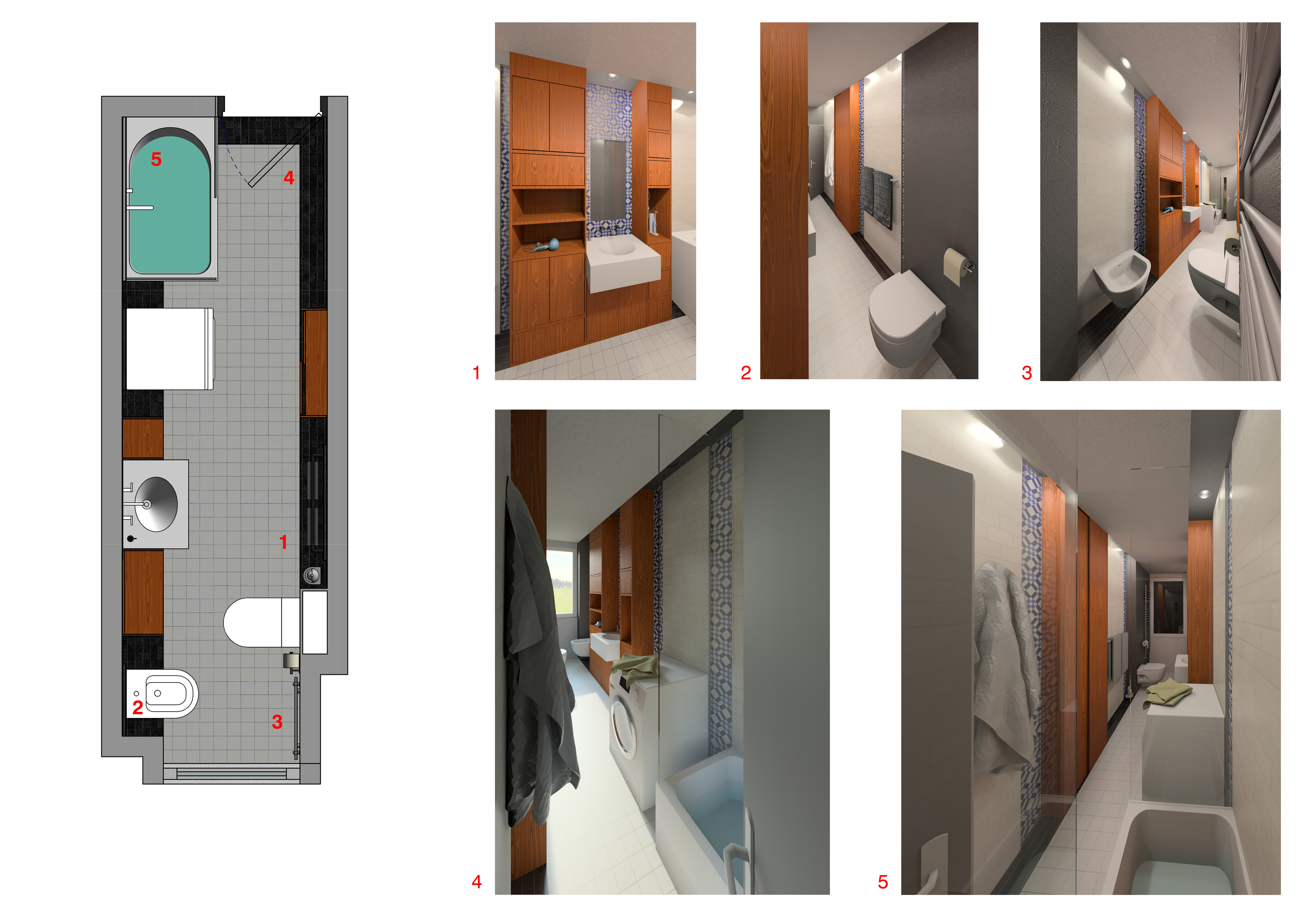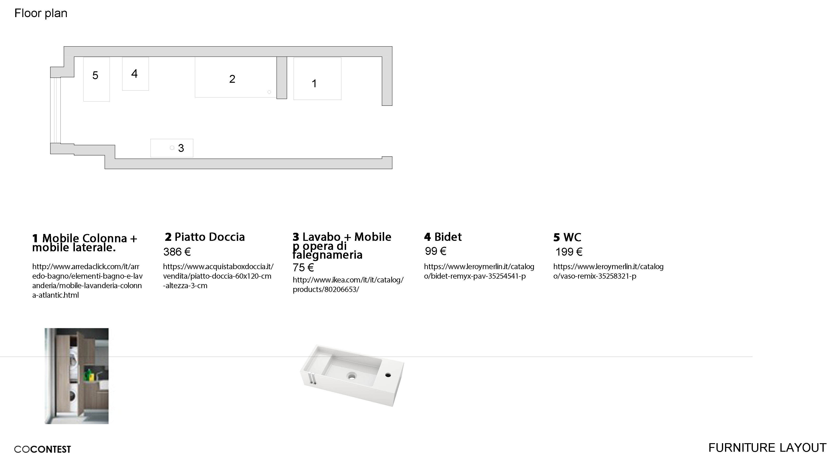 Il bagno dovrà avere i seguenti accessori: Bidet WC Doccia Lavabo Colonna lavatrice/asciugatrice Non dovrà avere la vasca