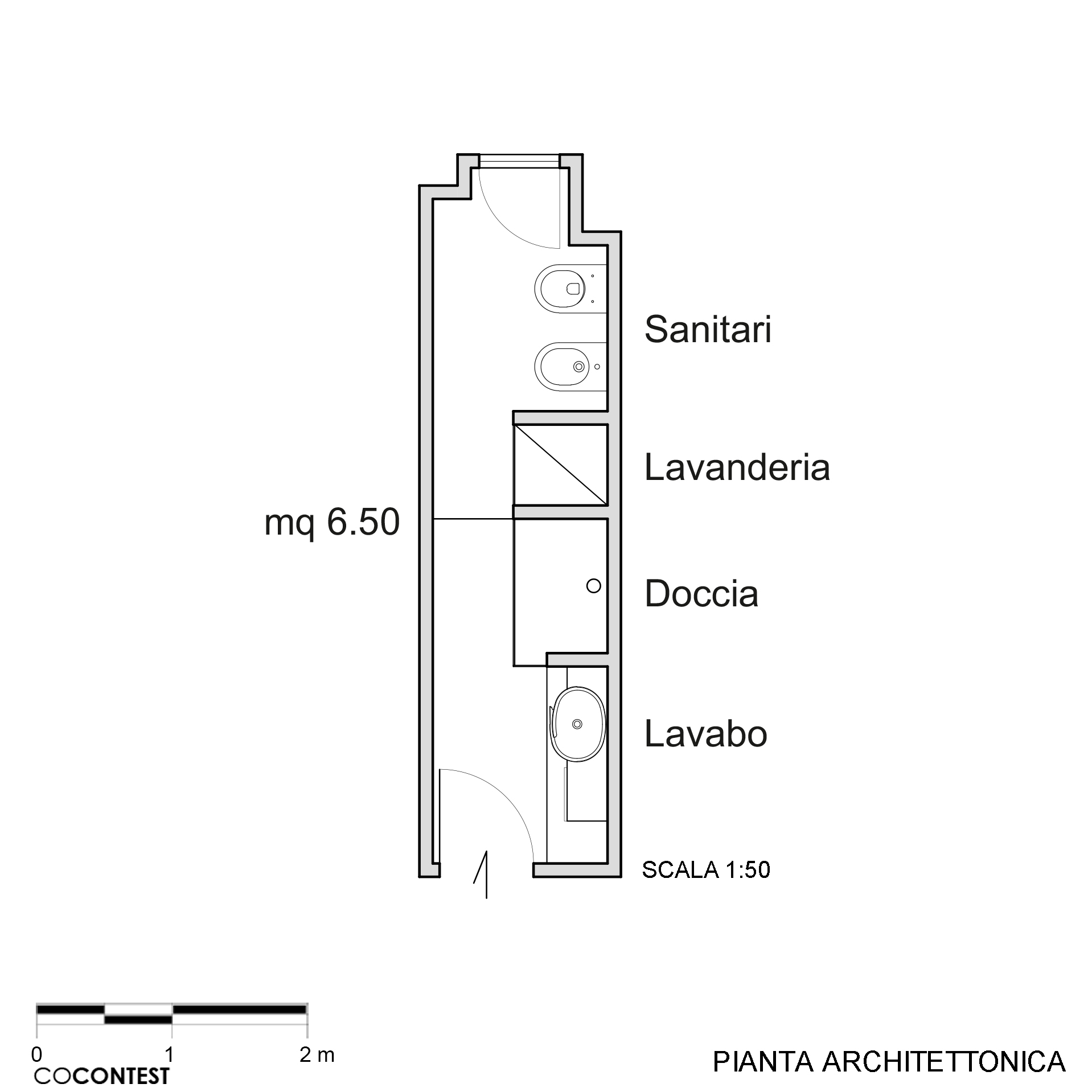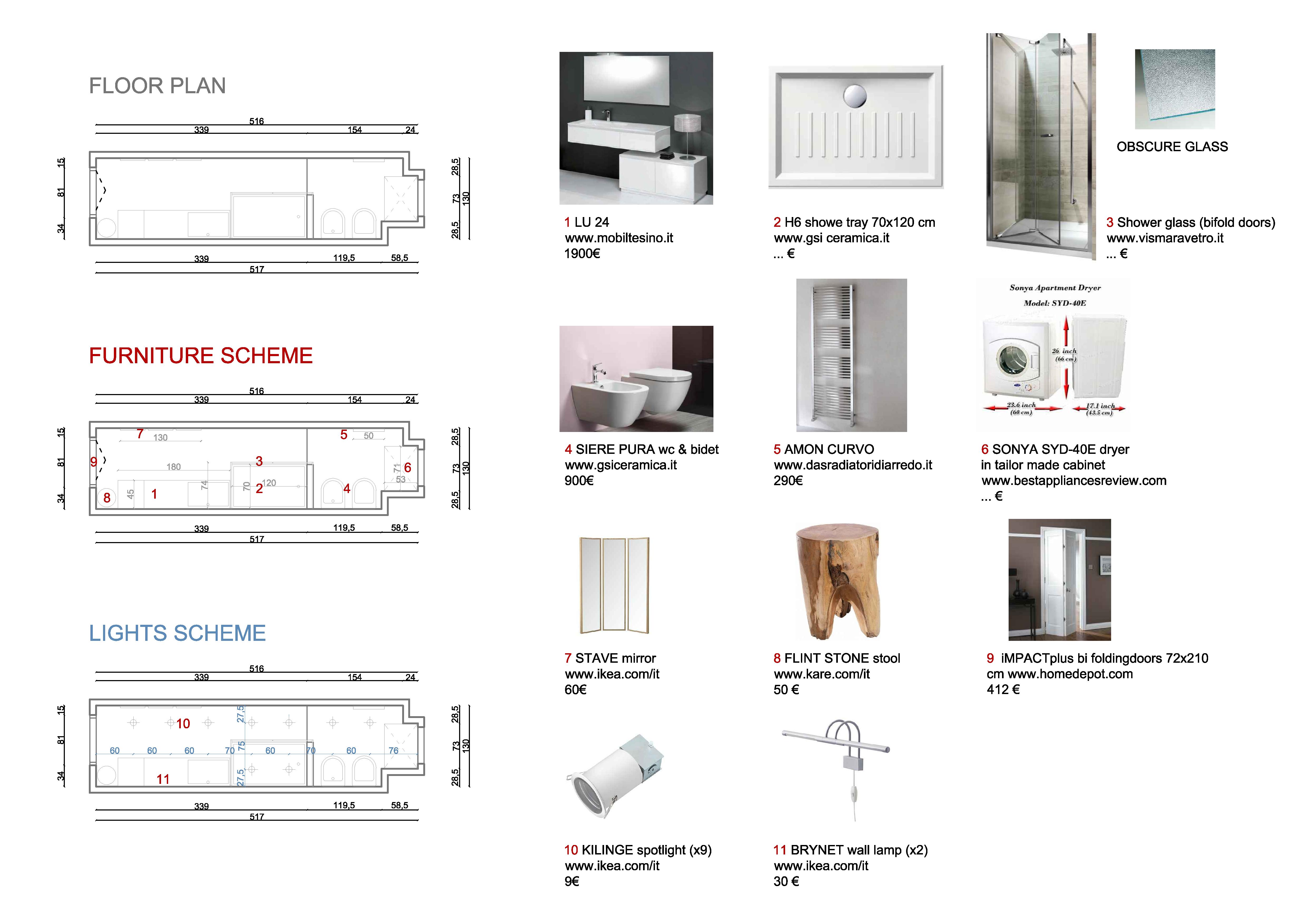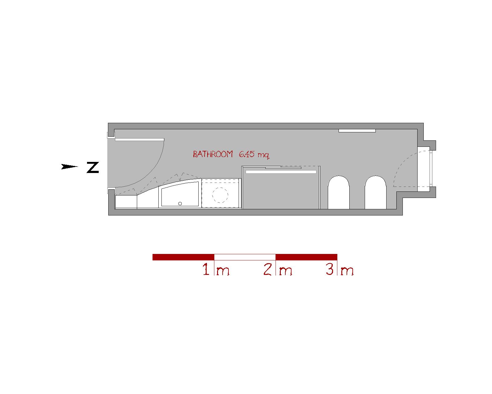 Il bagno è l'unico presente nell'appartamento vorremmo quindi coniugare la fruibilità dello stesso con l'estetica. L'idea è di rimpiazzare la vasca da bagno con una doccia, aggiungere un'asciugatrice. Il wc rimarrà nella posizione attuale poiché gli scarichi delle acque scure condominiali si trovano nella "scaffa" a destra della finestra.