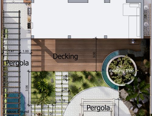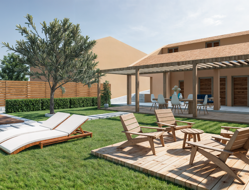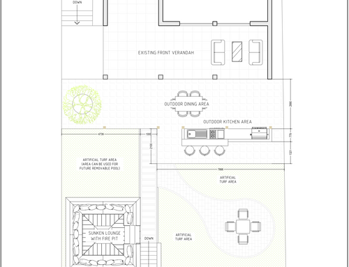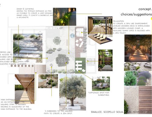 We have just renovated a beach house but we still have to decide what to do with the patio in front of the house. Not sure we want a pool since the beach is at walking. distance but we would like to have a bigger patio (we now have a small veranda with a roof (very hot in summer) but we would like to increase the living space outside. From the veranda to the "garden" there is a big step which I think should be level up. We were thinking about some decking but we are open to different solution. We want also to have a kitchen outside and a relaxing area with grass (I think fake (but good) grass because we have limited water resources) or something else. The field is a bit downhill. Finally there is an area, much lower (6 steps) which is now not used but we would like it to make it the shower and storage place. The big caveat to keep in mind is that the house is not reachable by any transport/car. The closest we get is around 60 meters and then it is necessary to walk. This should be kept in mind. I have already a proposal by one architect that I'm not convinced and I would like to have new proposal. A place for the pool can be planned but I would think more of a removable above ground swimming pool