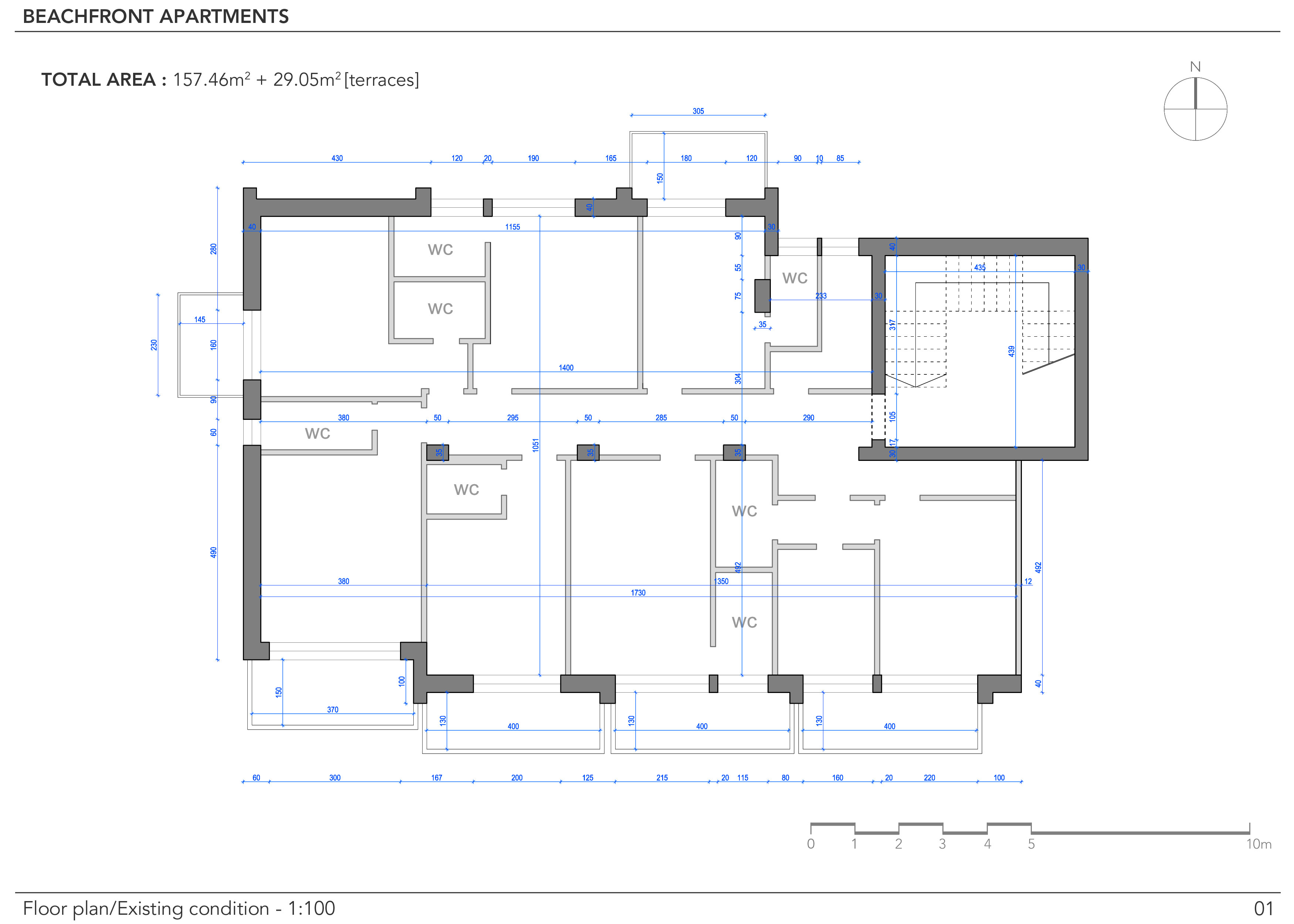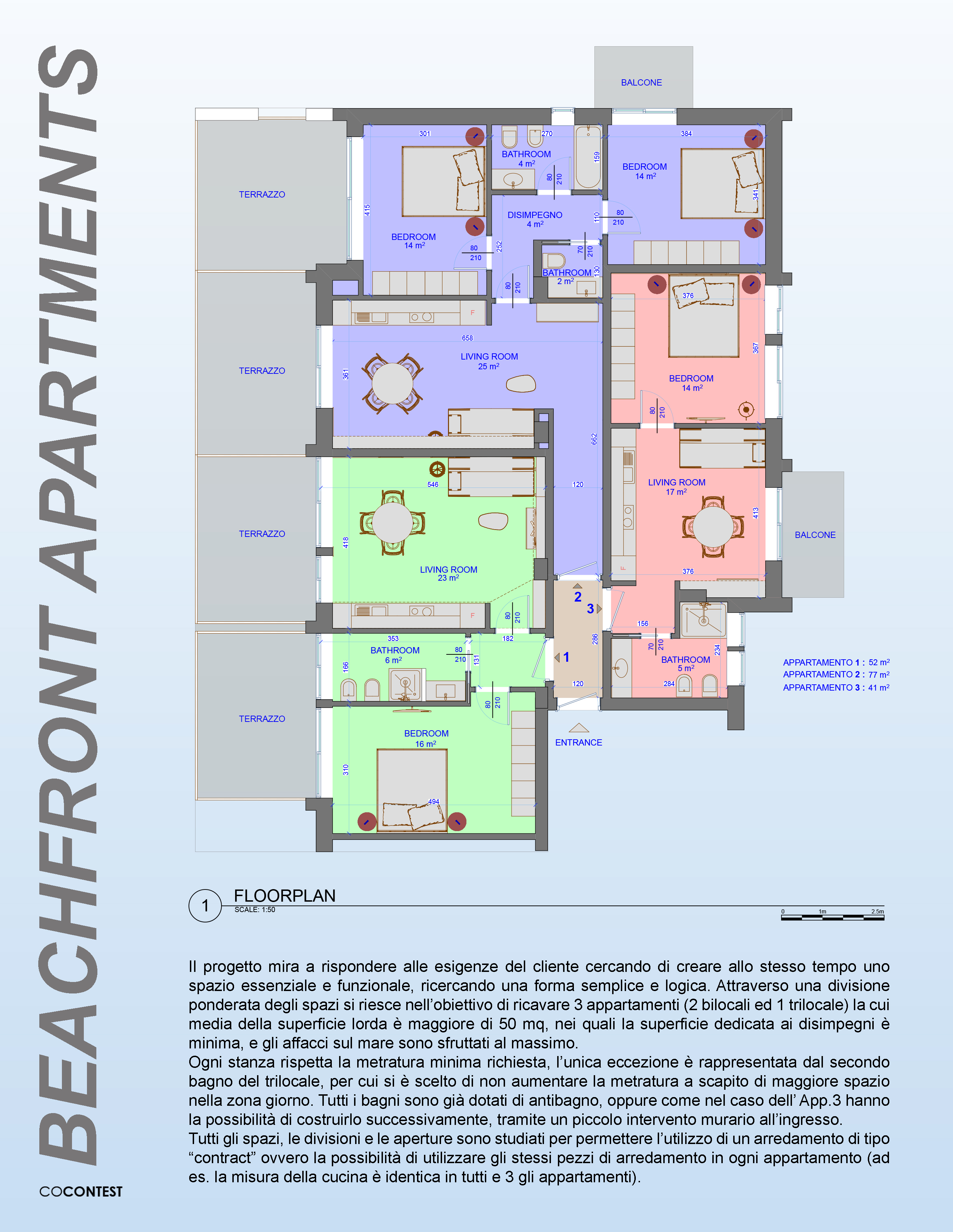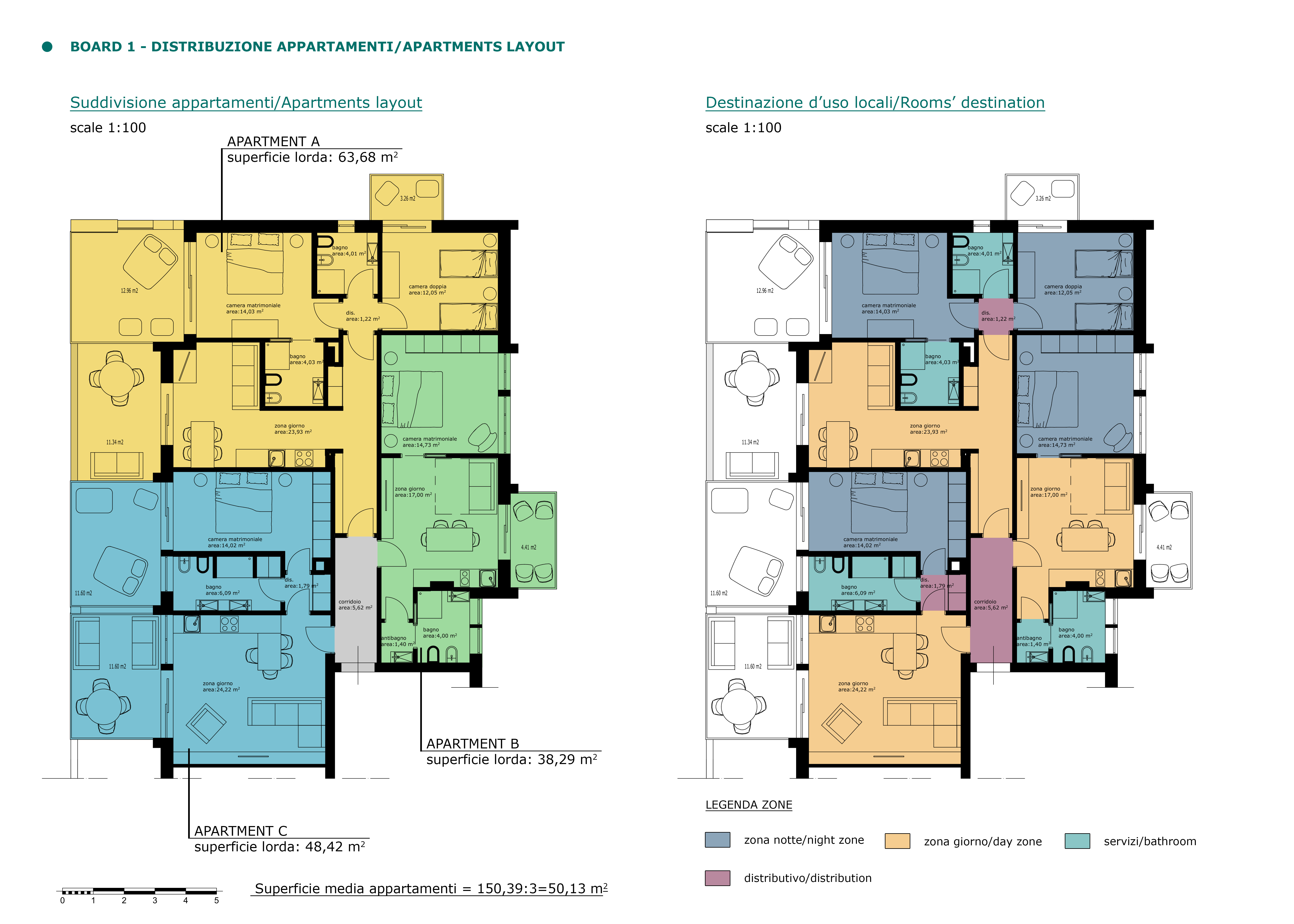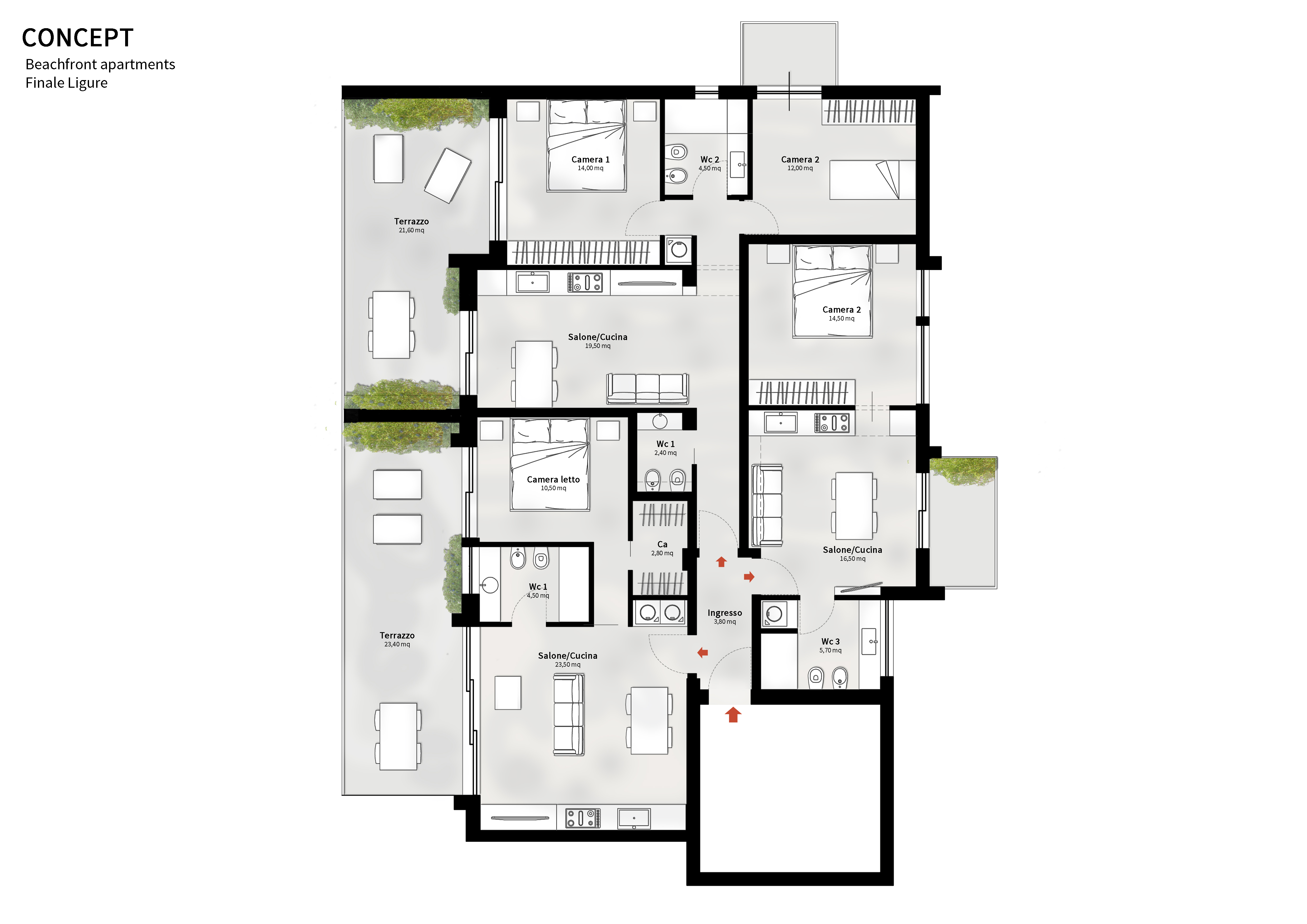 L’obiettivo è quello di frazionare l’immobile in più unità immobiliari, massimizzando le potenzialità degli affacci con i terrazzi/balconi e riducendo al minimo l’impiego di mq per il disimpegno di accesso alle singole unità.