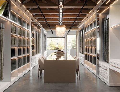 All-white display systems (shelving, drawers, panels) to make colorful rugs pop.
