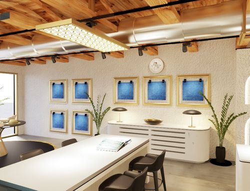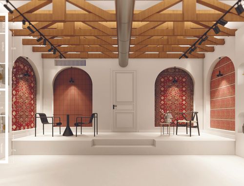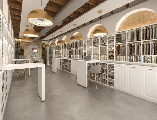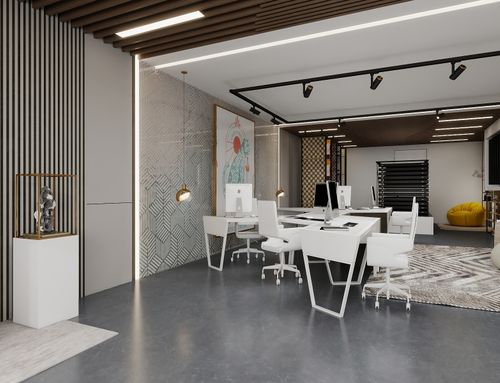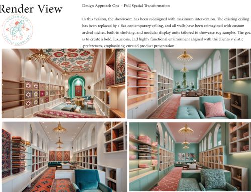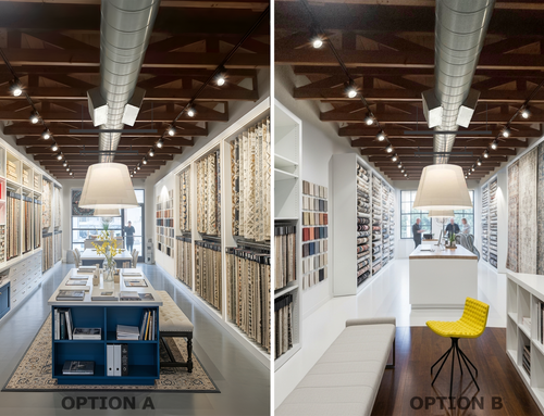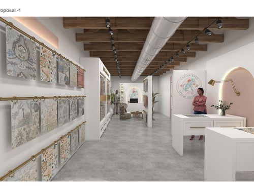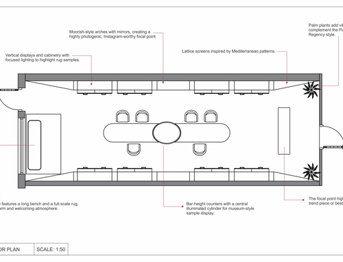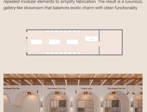 I’m seeking a clean, high-impact interior design concept for a 900-square-foot rug showroom that will serve as both a retail space and a design studio.