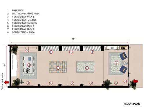 Layout for 900 sq ft showroom (approximate dimensions: flexible)