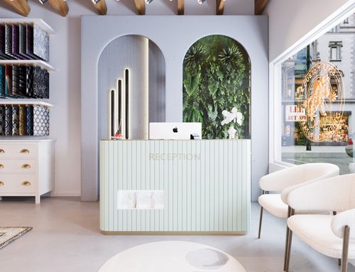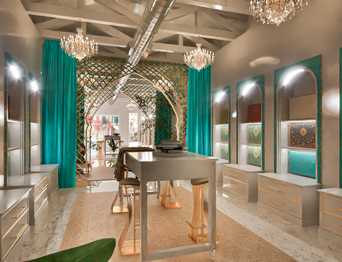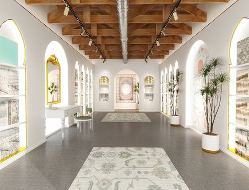 Luxury Rug Showroom – Modular White Fixtures with Palm Beach Regency & Moorish Influence