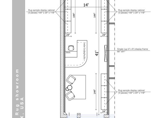 Modular built-in fixtures for hanging and storing rug samples (my cabinet team will build them) and samples are 1.6 ft x 1.6 ft.