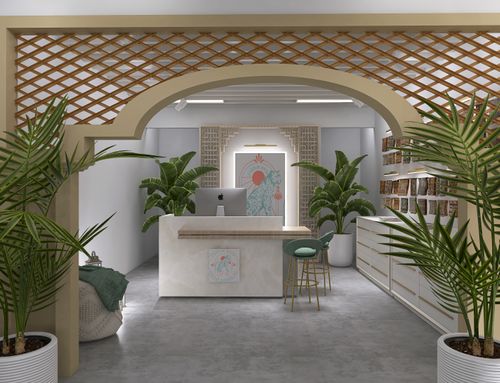 My vision is bold and editorial, blending Grandmillennial charm, Palm Beach Regency glamour, and Moorish architectural elements. Think: crisp white walls and fixtures, arched shapes, gold detailing, layered textures, and a hint of exotic resort nostalgia. The space should feel more like a curated gallery than a traditional rug store.