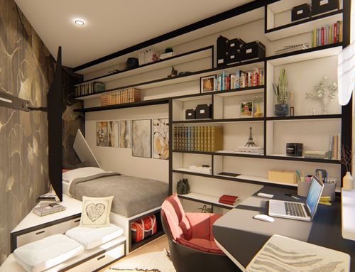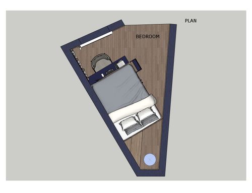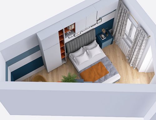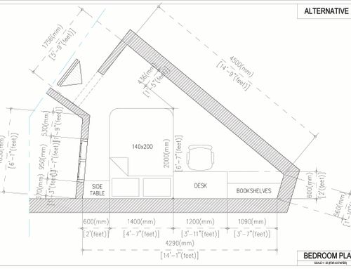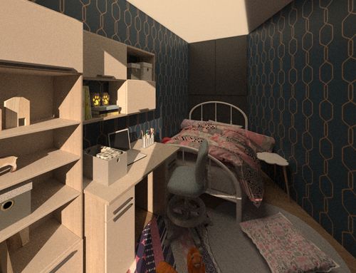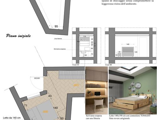 I don't know how to furnish my daughter's bedroom, it is very irregular. I am especially interested in understanding how to arrange the furniture: I would like to include, in addition to the bed, a desk and a bookcase. I would also like to know if it is possible, instead of the single bed, to put a more spacious bed (140 cm).