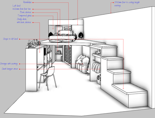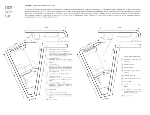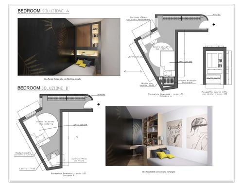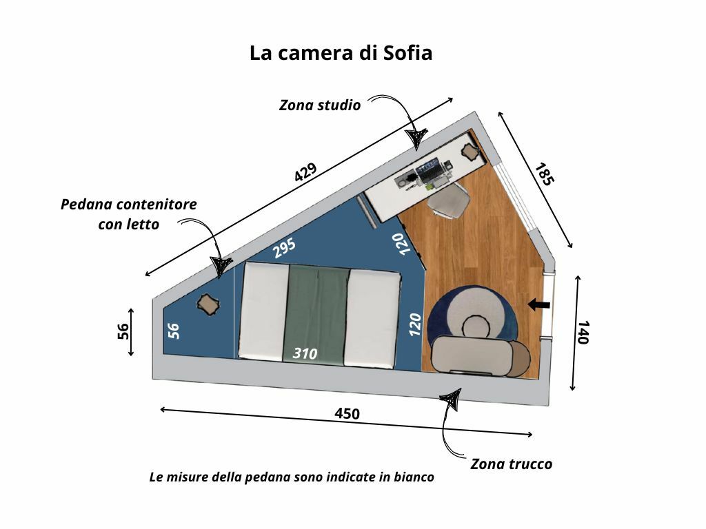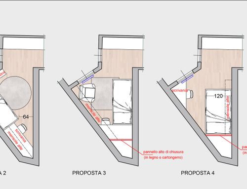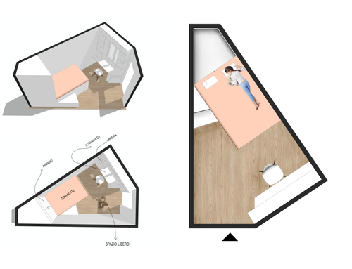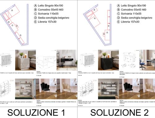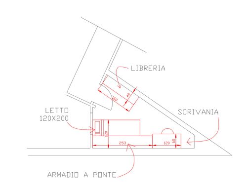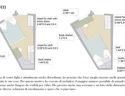 Non so come arredare la stanza da letto di mia figlia, è molto irregolare. Mi interessa soprattutto capire come disporre i mobili: vorrei che fossero previsti, oltre al letto, anche una scrivania e una libreria. Vorrei anche sapere se è possibile, invece del letto singolo, mettere un letto più spazioso (140 cm).