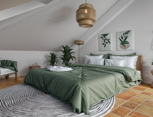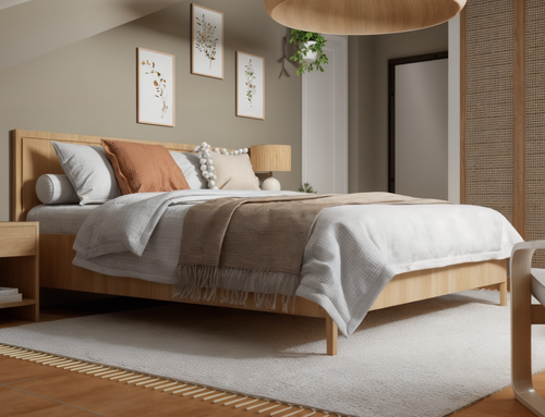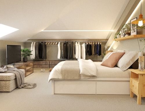 I want to create a cozy bedroom with light colors. The room should have a spacious wardrobe to store clothes for two people. I would like the wardrobe to include shelving solutions. The flooring cannot be changed. It would be nice if the furnishings also consider Feng Shui, but it's not essential. I love natural materials and minimal style. I would like to have an area for temporary clothes storage, could be a chair (currently I use a chair) or something other. Please note the room is a mansard. In the room there are two sides of the roof. The minimum heigh is 998 cm. the highest (over the door ) is 362 cm
