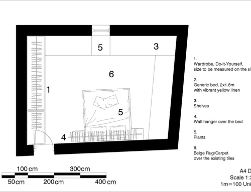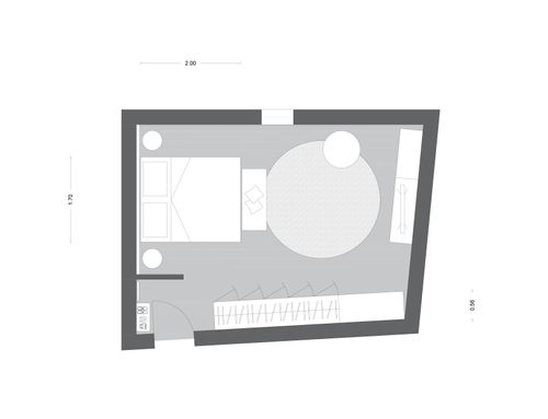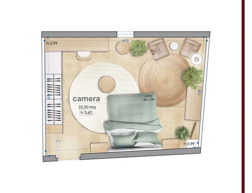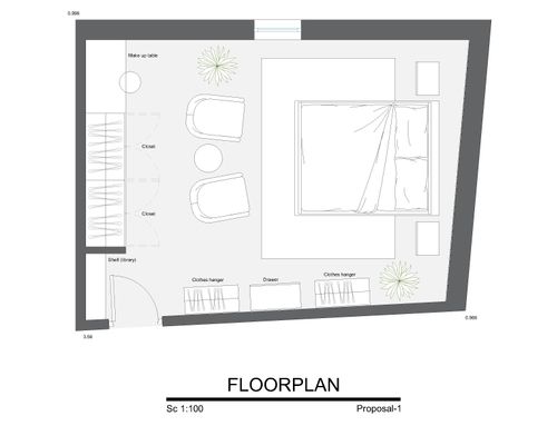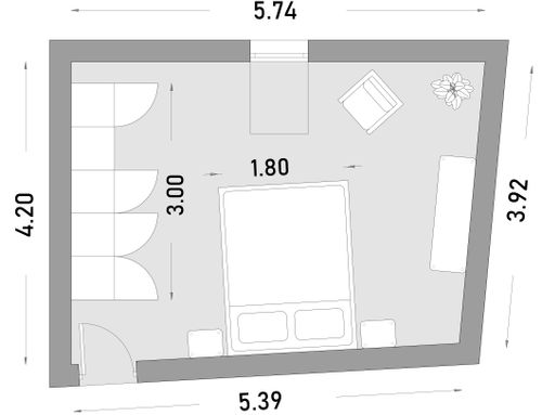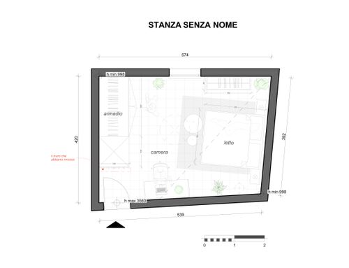 Voglio creare una camera da letto accogliente con colori chiari. La stanza dovrebbe avere un armadio spazioso per riporre i vestiti per due persone. Vorrei che l'armadio includesse soluzioni di scaffalature. La pavimentazione non può essere modificata. Sarebbe bello che anche l'arredamento tenesse conto del Feng Shui, ma non è fondamentale. Amo i materiali naturali e lo stile minimal. Mi piacerebbe avere uno spazio per riporre temporaneamente i vestiti, potrebbe essere una sedia (attualmente uso una sedia) o qualcos'altro. Si prega di notare che la camera è una mansarda. Nella stanza ci sono due lati del tetto. L'altezza minima è 998 cm. il più alto (sopra la porta) è 362 cm