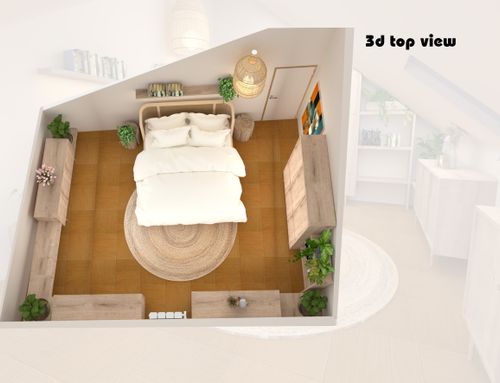 Quiero crear un dormitorio acogedor con colores claros. La habitación debe contar con un armario espacioso para guardar ropa para dos personas. Me gustaría que el armario incluyera soluciones de estanterías. El suelo no se puede cambiar. Sería bueno que el mobiliario también considerara el Feng Shui, pero no es imprescindible. Me encantan los materiales naturales y el estilo minimalista. Me gustaría tener un área para guardar ropa temporalmente, podría ser una silla (actualmente uso silla) u otra cosa. Tenga en cuenta que la habitación es una buhardilla. En la habitación hay dos lados del techo. La altura mínima es de 998 cm. el más alto (sobre la puerta) mide 362 cm.