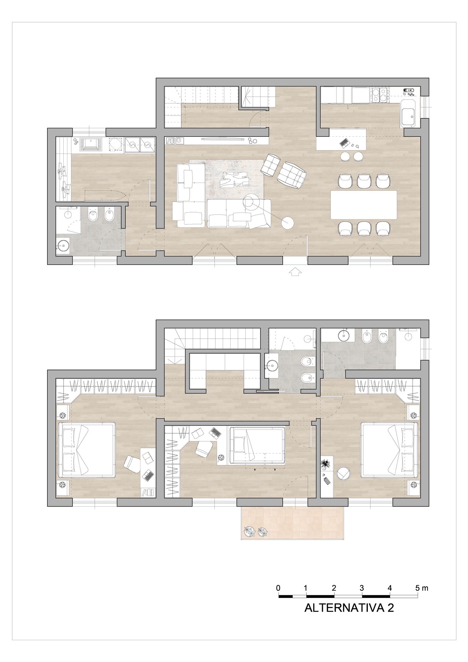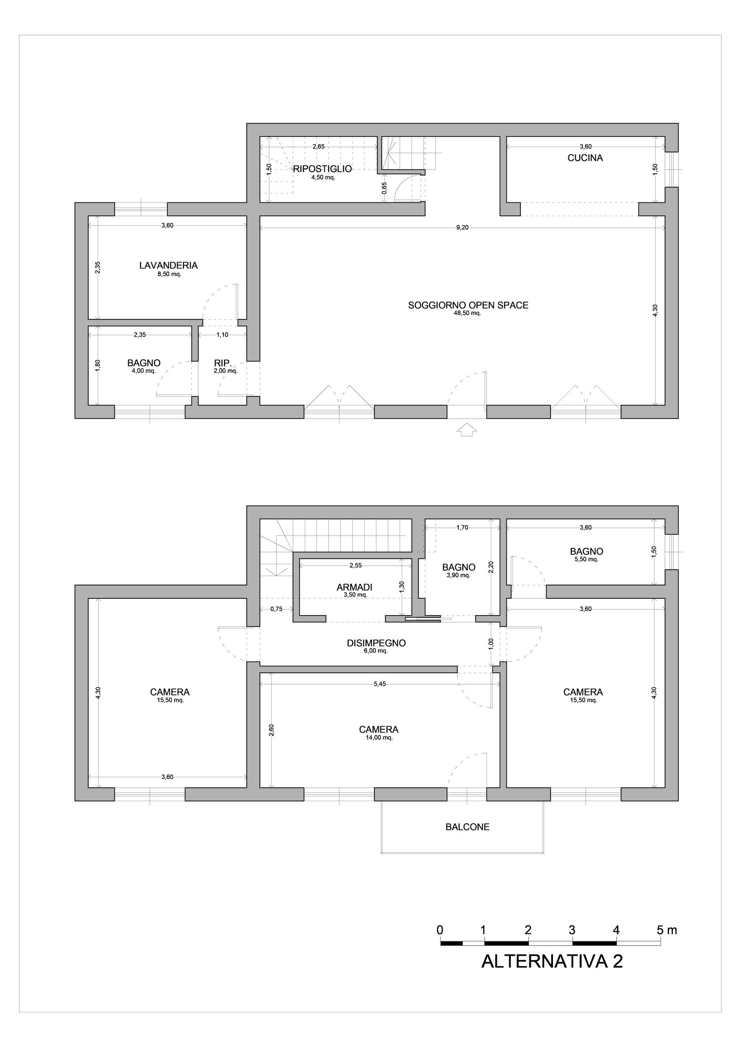 Questa soluzione prevede interventi strutturali sia di modifica delle pareti portanti (con relative cerchiature metalliche), sia di modifica del vano scala con taglio e ricostruzione del solaio.