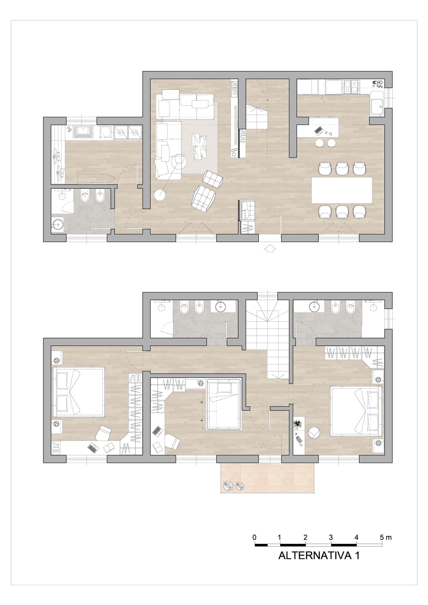 ⦁ PIANO TERRA: ampio ingresso attrezzato con piccolo guardaroba e panca, con accesso diretto al vano scala, mantenuto in posizione. Area giorno open space, con cucina e zona pranzo nell'ala destra e soggiorno/TV alla sinistra. Area servizi ricavata all'interno del garage, con bagno e lavanderia, per cui verrà ricavato un accesso dall'interno della zona giorno, con opportuno disimpegno.