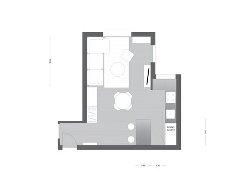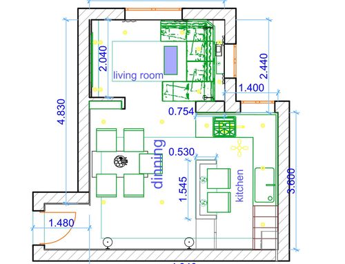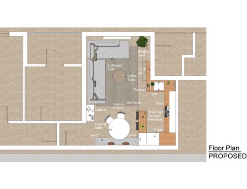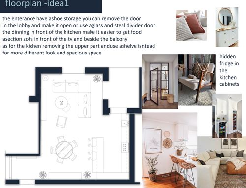 Possibly, I would like to keep the table and chairs (Nordic style); I could change the sofa. I can get rid of the living room furniture which should be replaced anyway by some "containing" solutions. I have a TV.