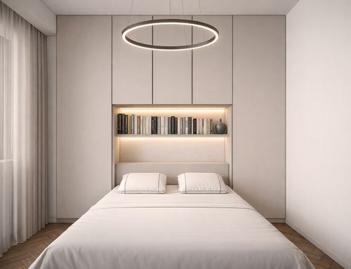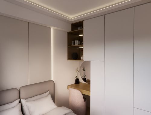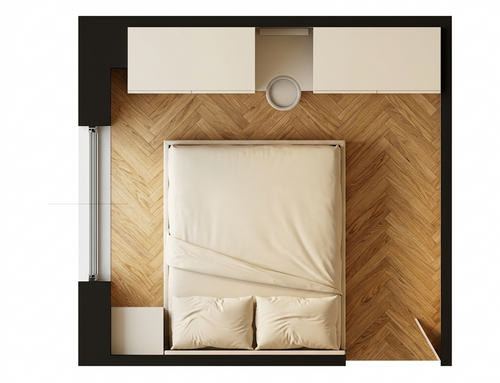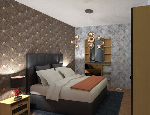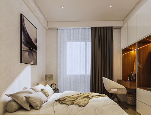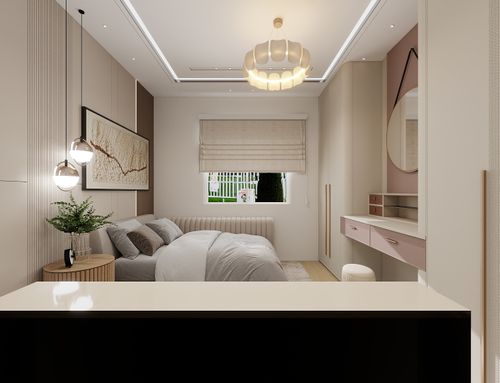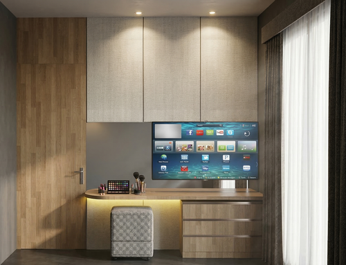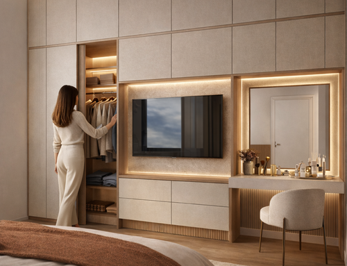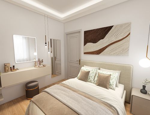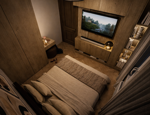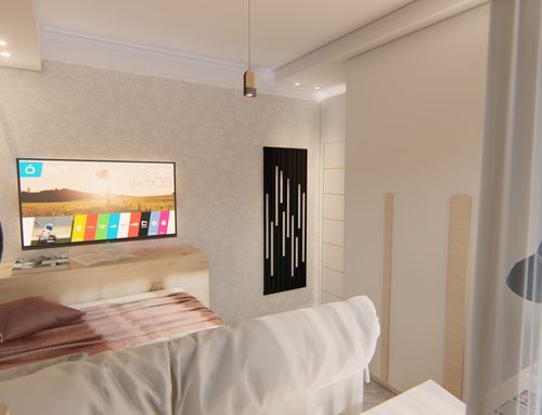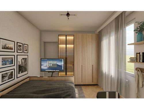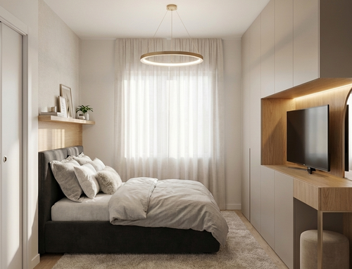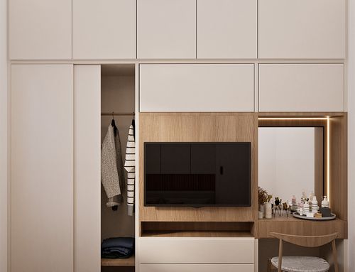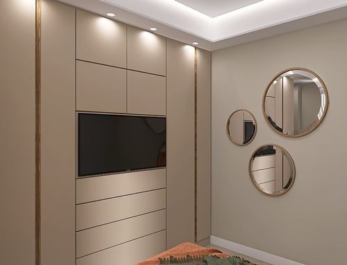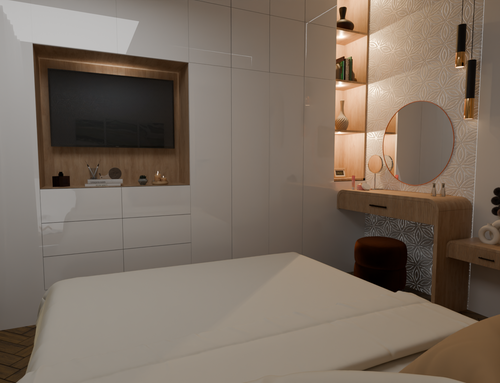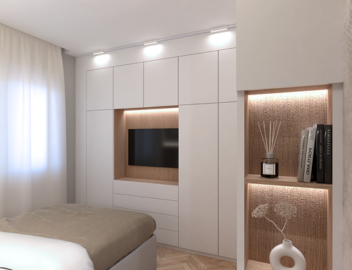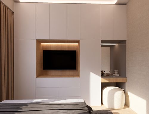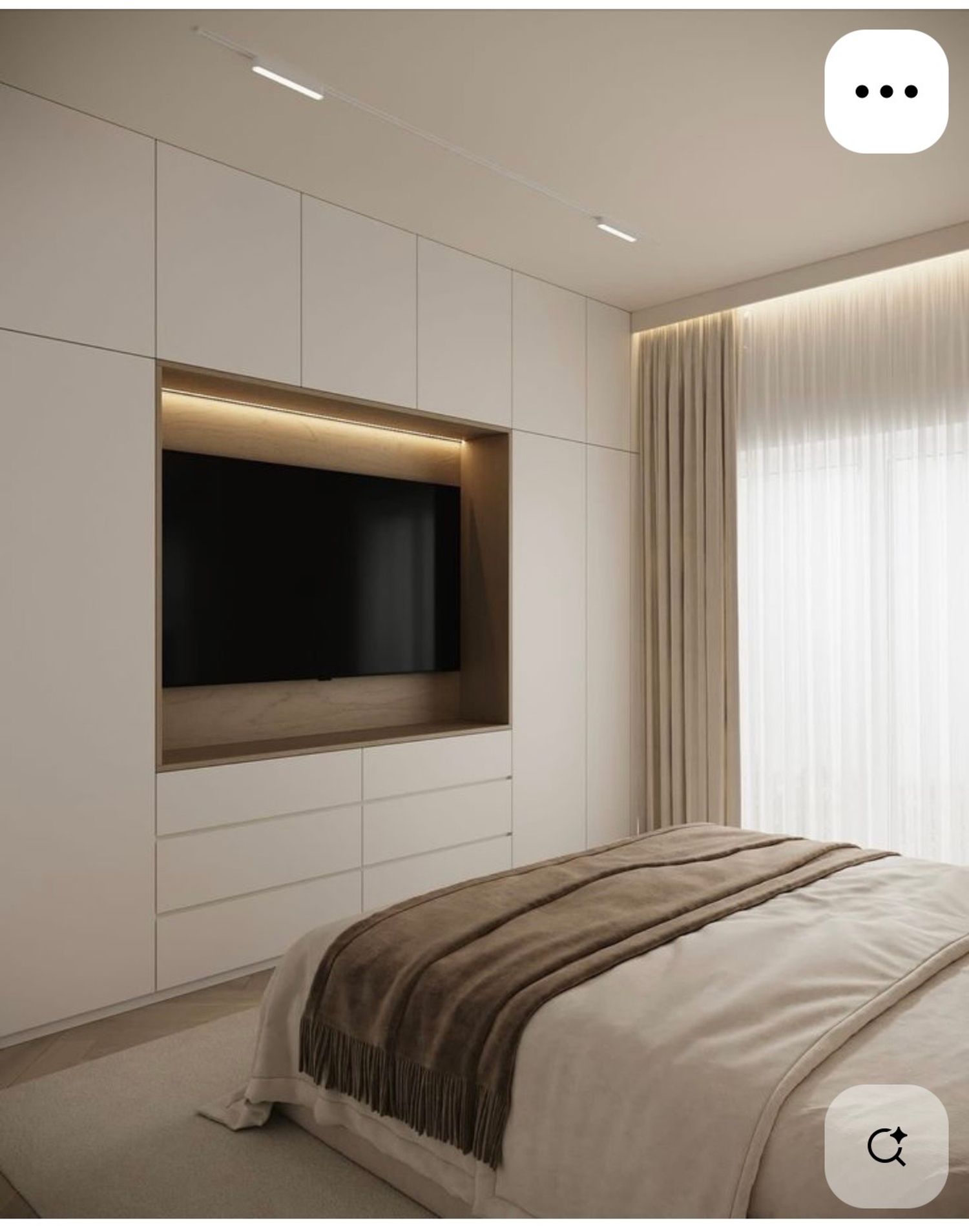 I would like a modern bedroom with a wardrobe and, if possible, a dedicated vanity area. I would also like to have a TV in the bedroom.