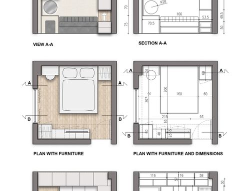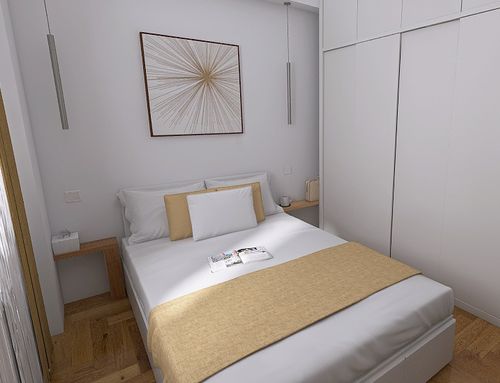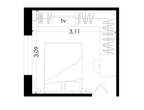 The entrance door will be replaced with a folding door to increase usable space. If necessary, I could also place the double bed on the opposite wall, using a French-size bed.