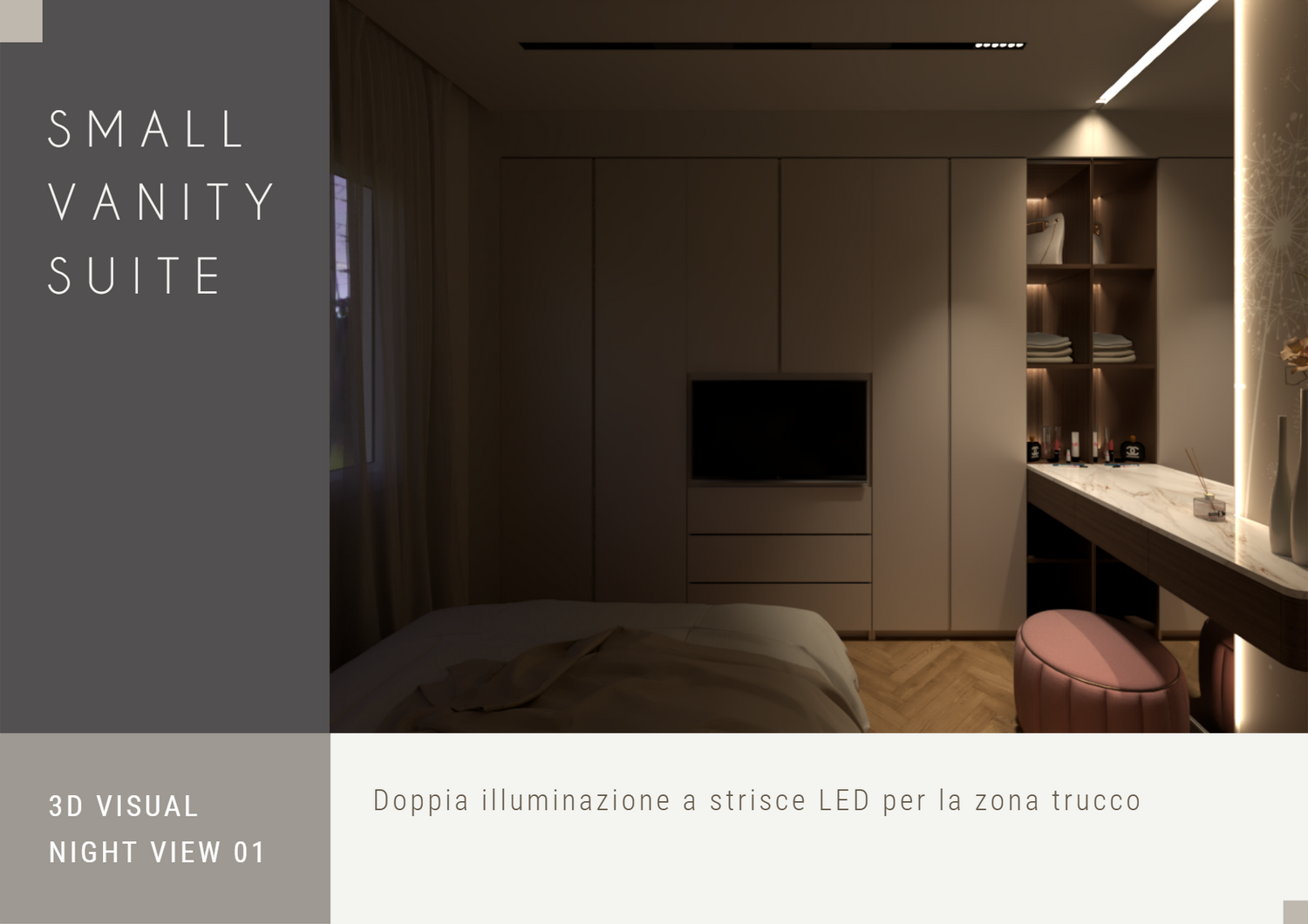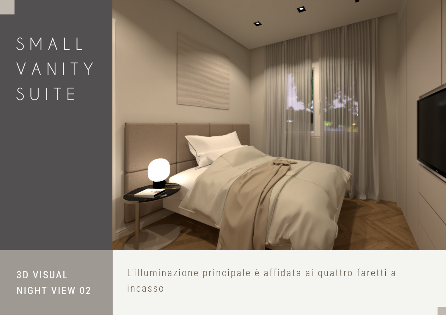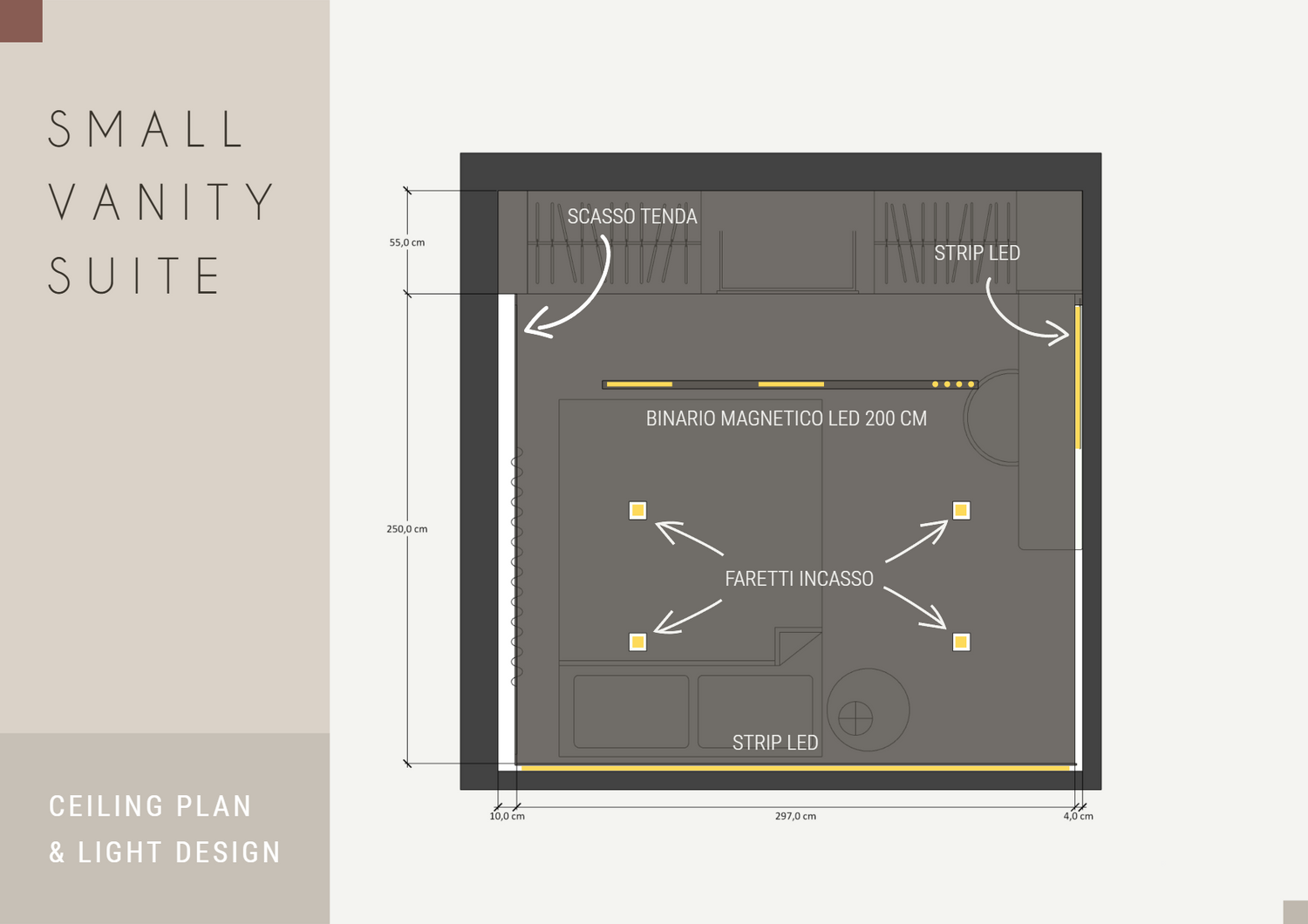 L’illuminazione principale è affidata a 4 faretti a incasso, affiancati da luci d’accento per i vari momenti abitativi. Un binario per il guardaroba, strisce LED per il trucco, lampada da lettura.