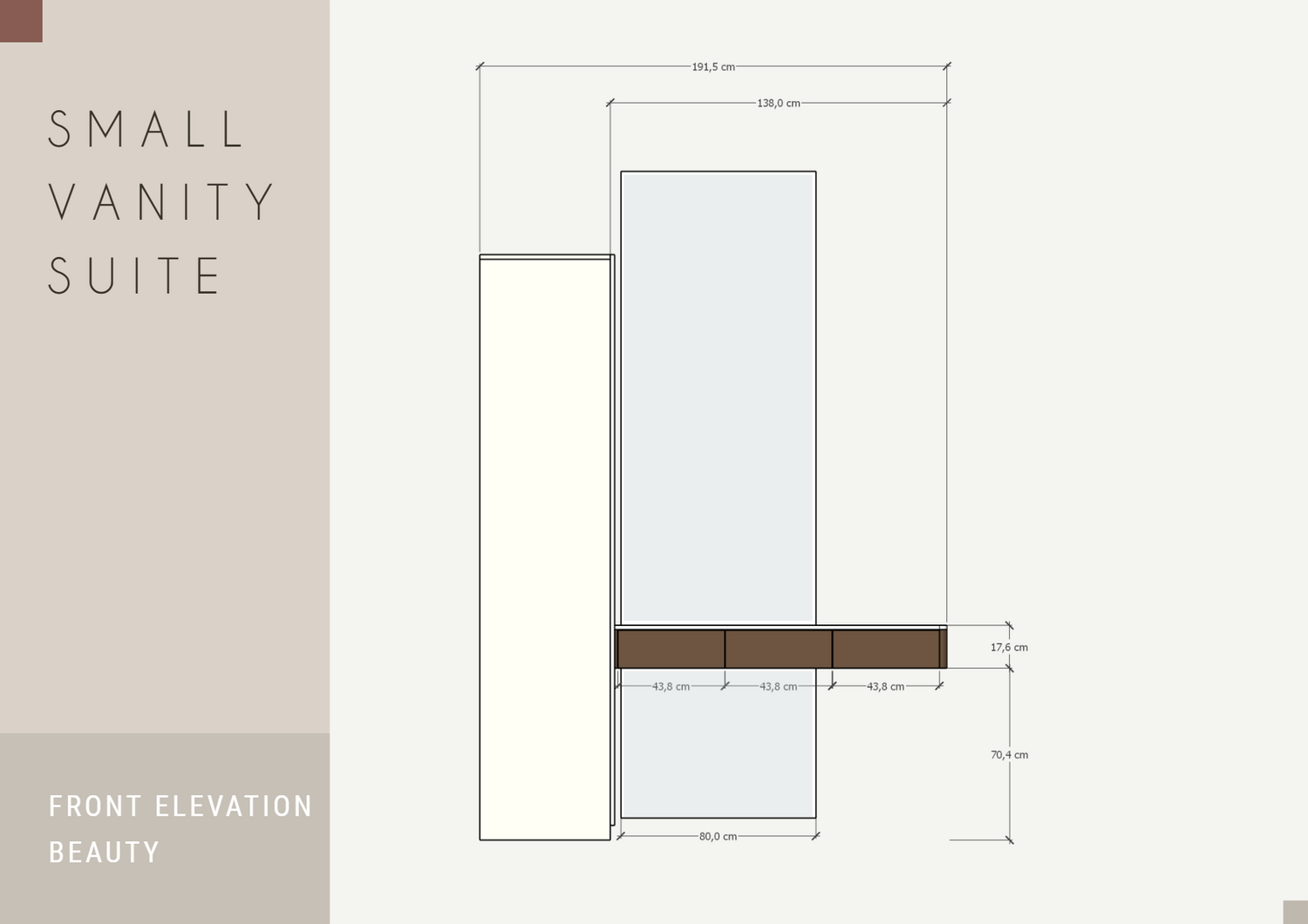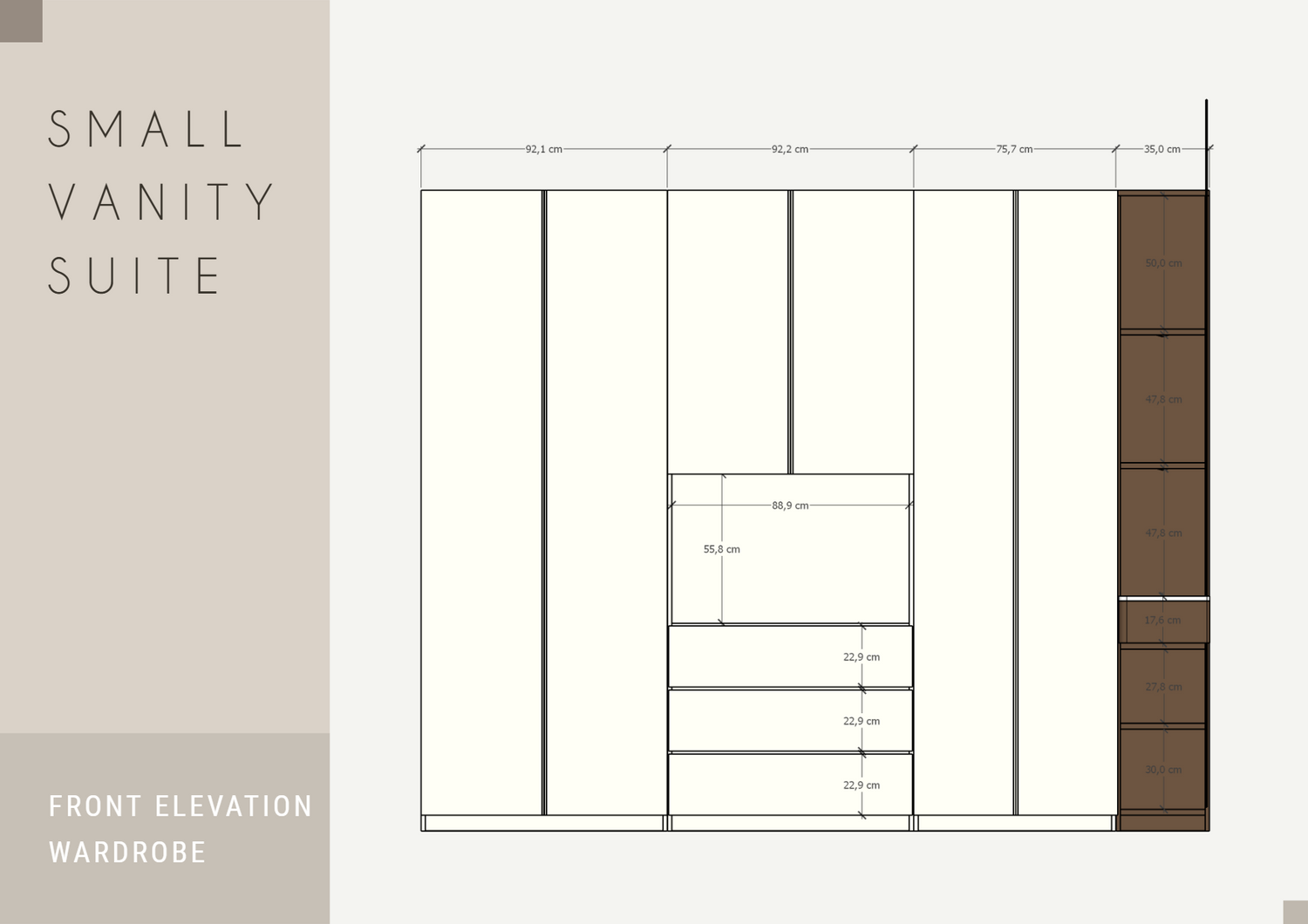 Il guardaroba a tutta parete è una soluzione ibrida a partire da una base di fabbrica con armadiatura a 6 ante, cassettiera e pannello TV, modificata su misura da un lato per ottenere una scaffalatura a giorno estesa verso la zona beauty.