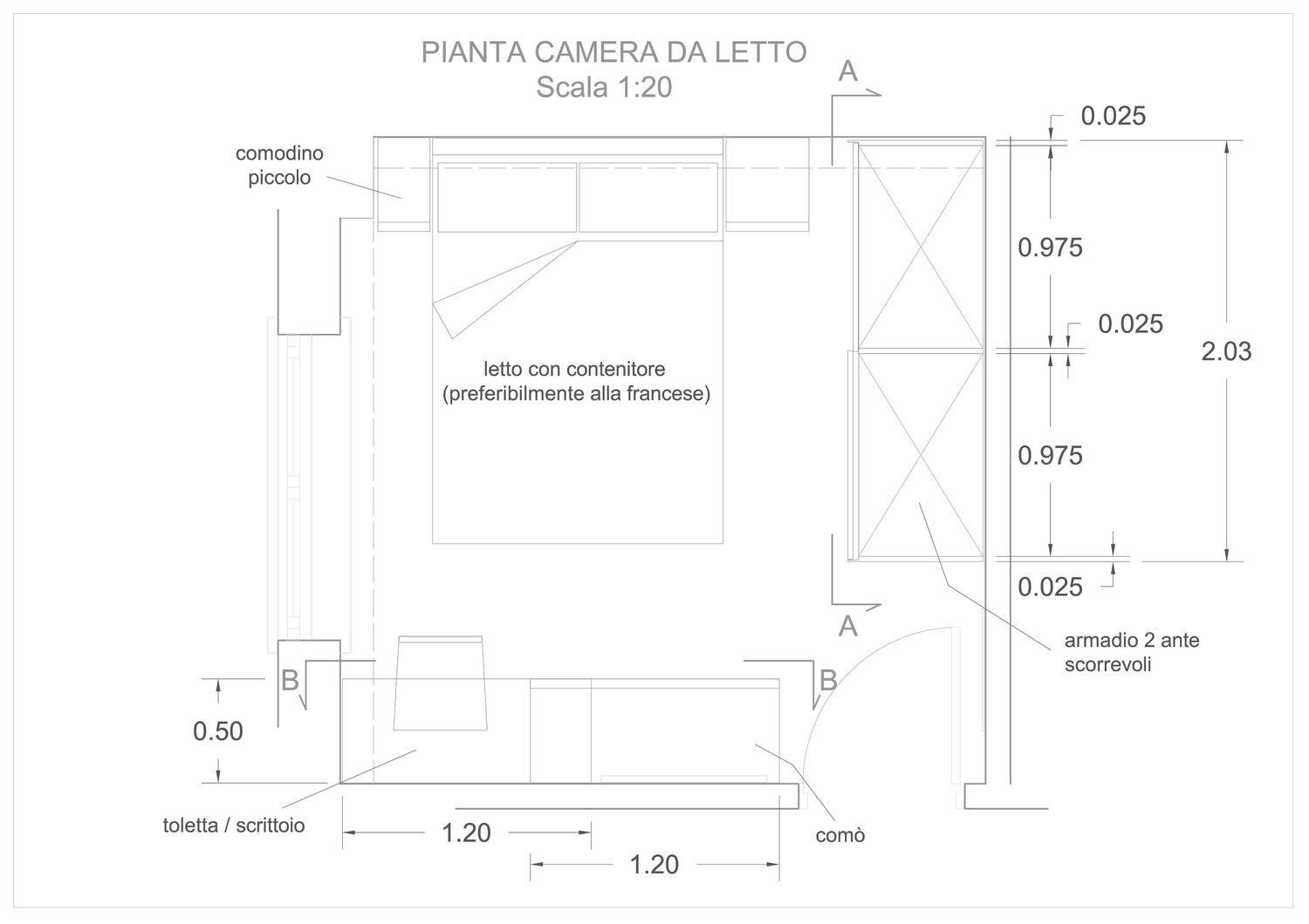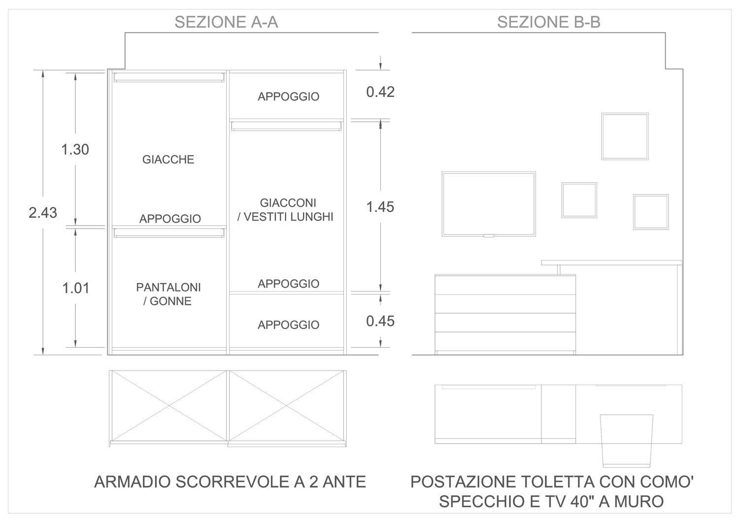 A seguito delle richieste specifiche di inserire armadiatura quanto più capiente possibile differente dalla struttura a ponte, di uno spazio toletta e del posizionamento di un televisore a 40 pollici, la soluzione migliore individuato può essere così riassunta: