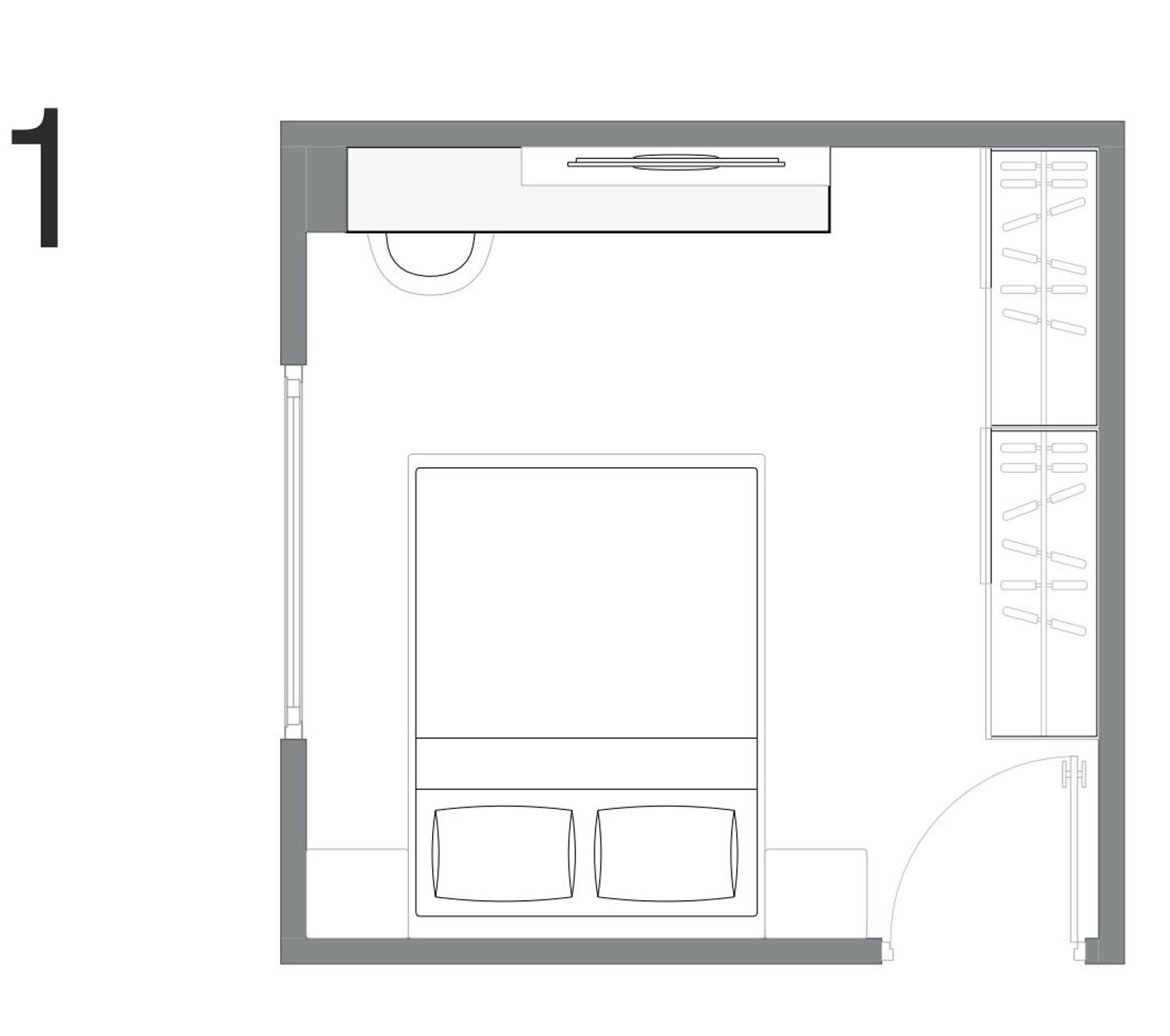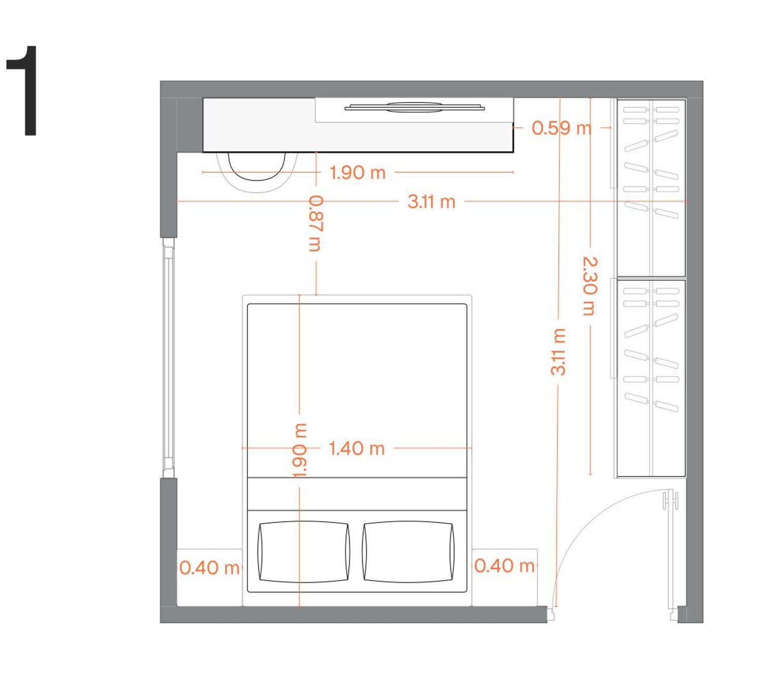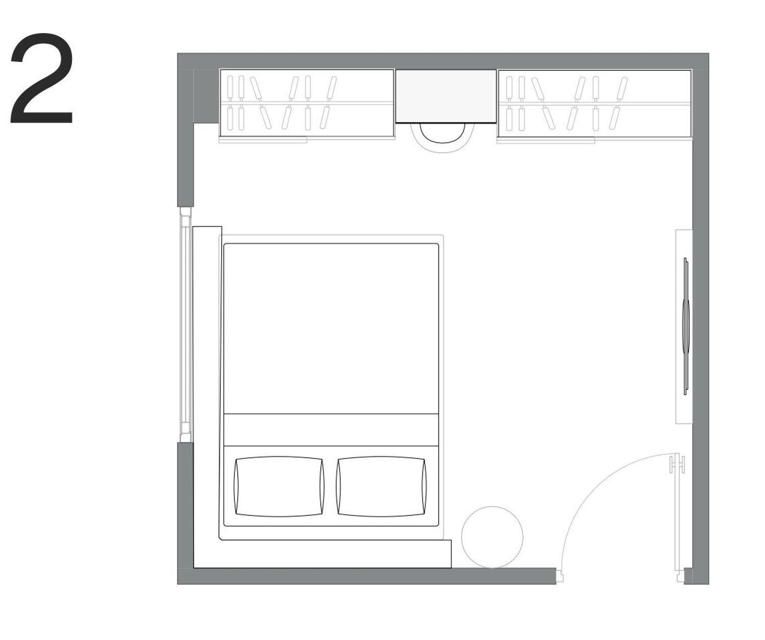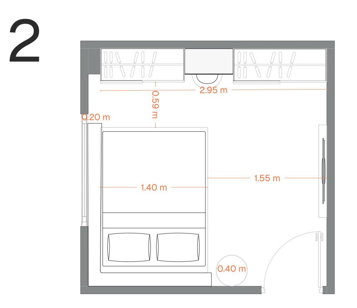Based on your requirements, I developed two layout options for your bedroom renovation. Both proposals respect your preferred bed size (140 cm) while focusing on improving functionality, movement, and overall comfort within the space.