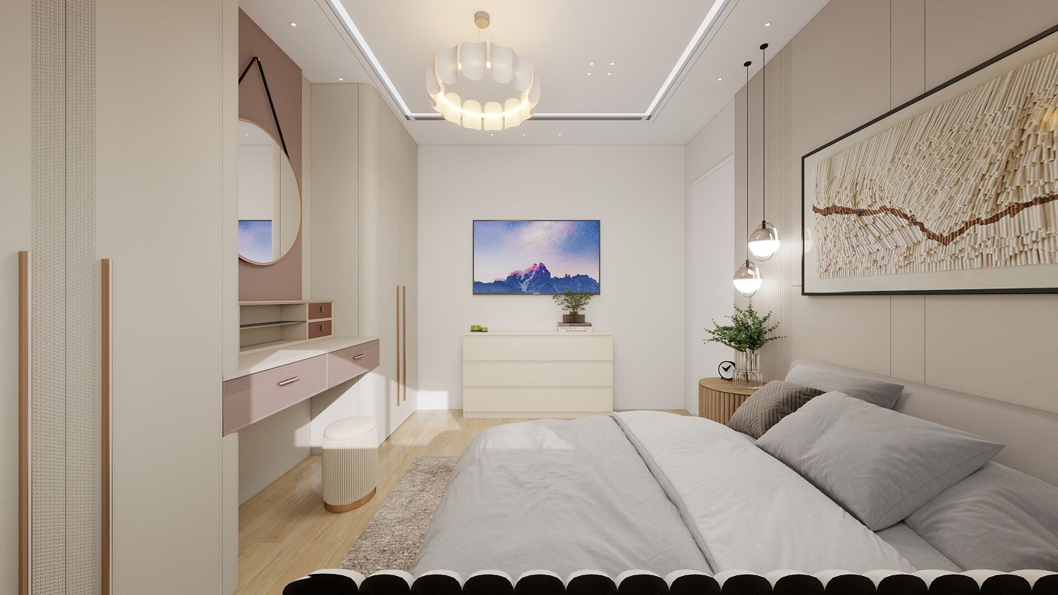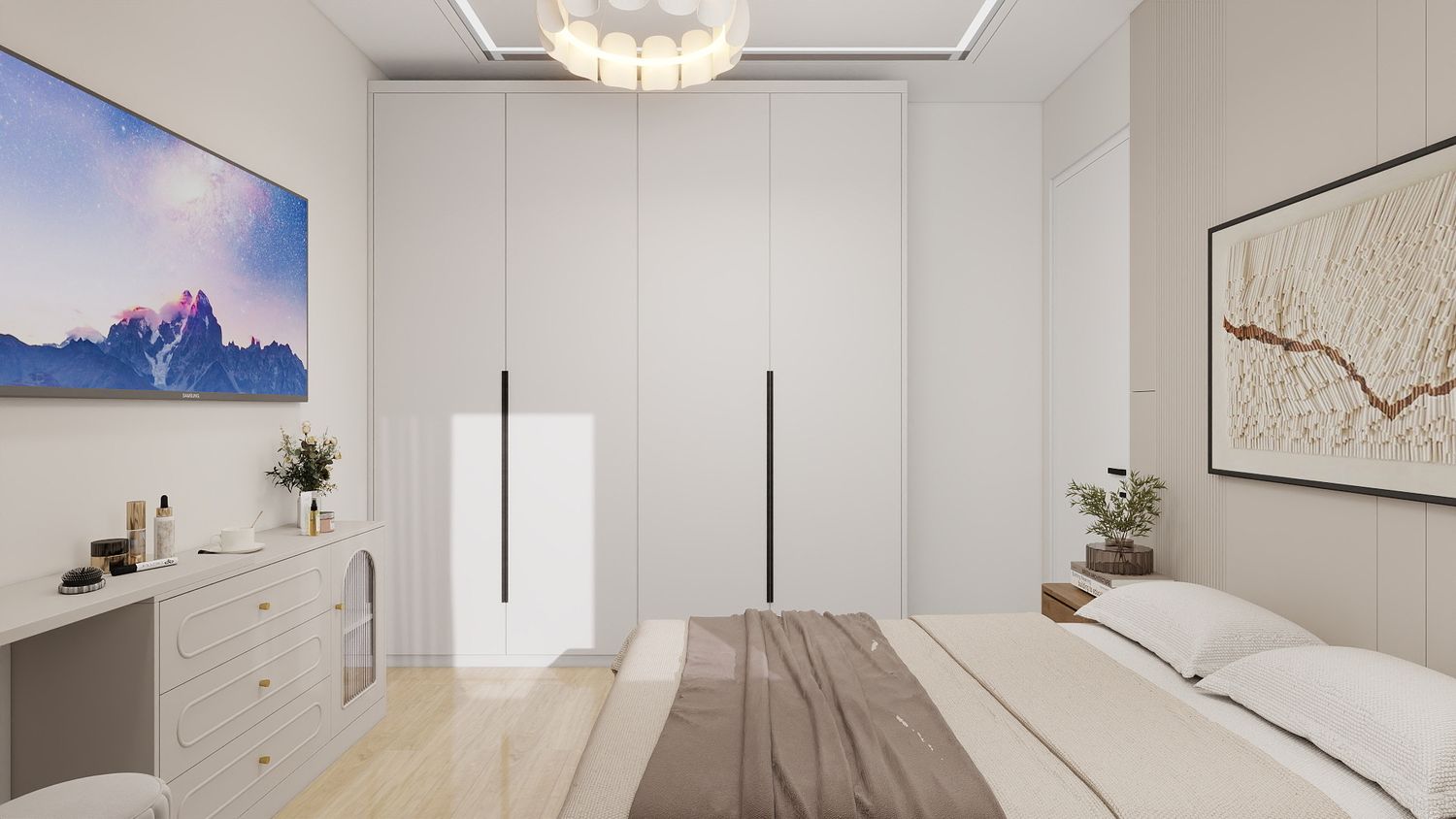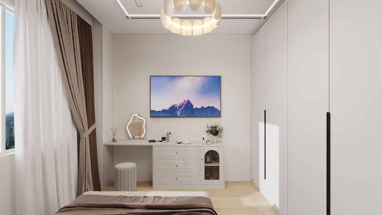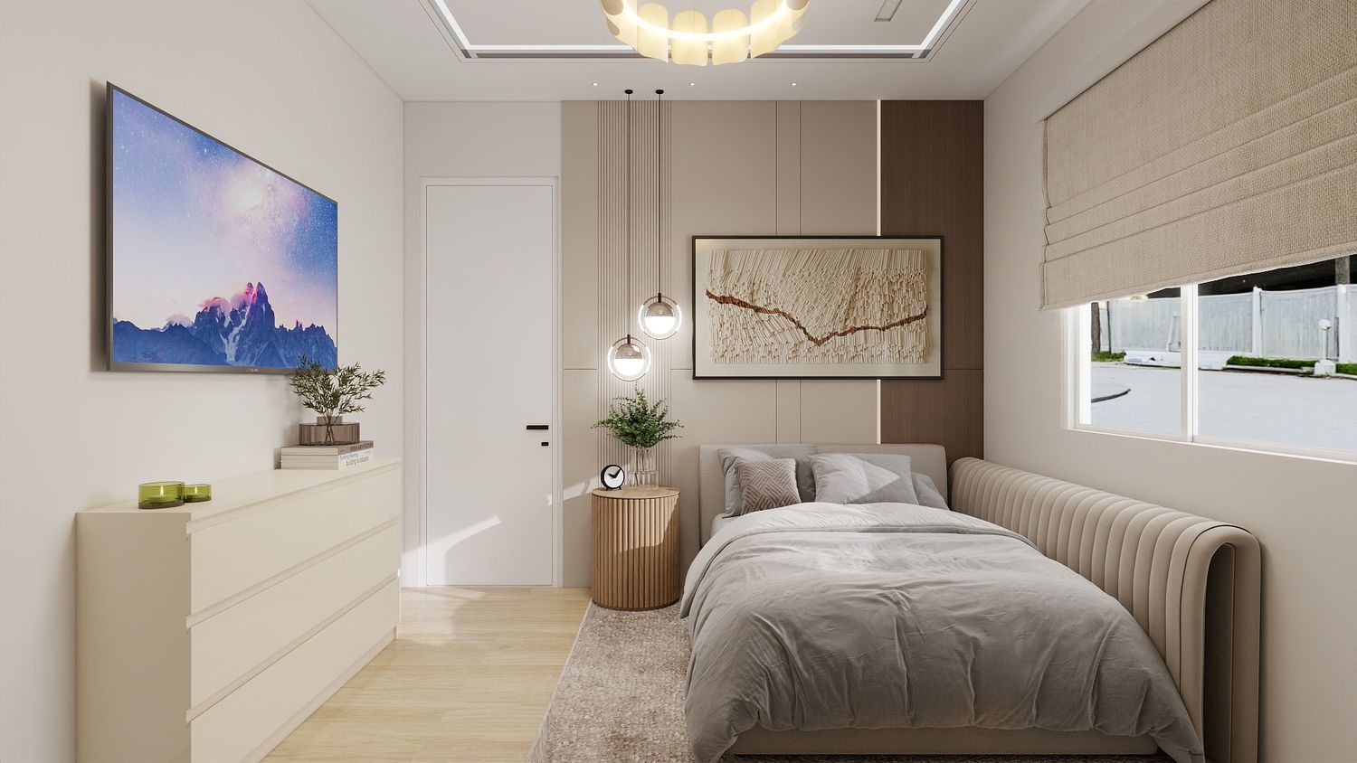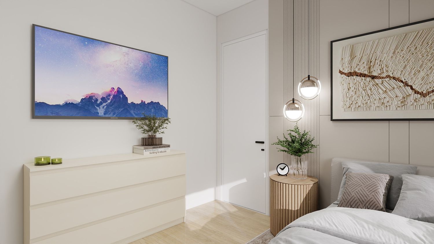 Opposite the bed, I designed a TV wall combined with a dresser, creating a practical and organized focal point.