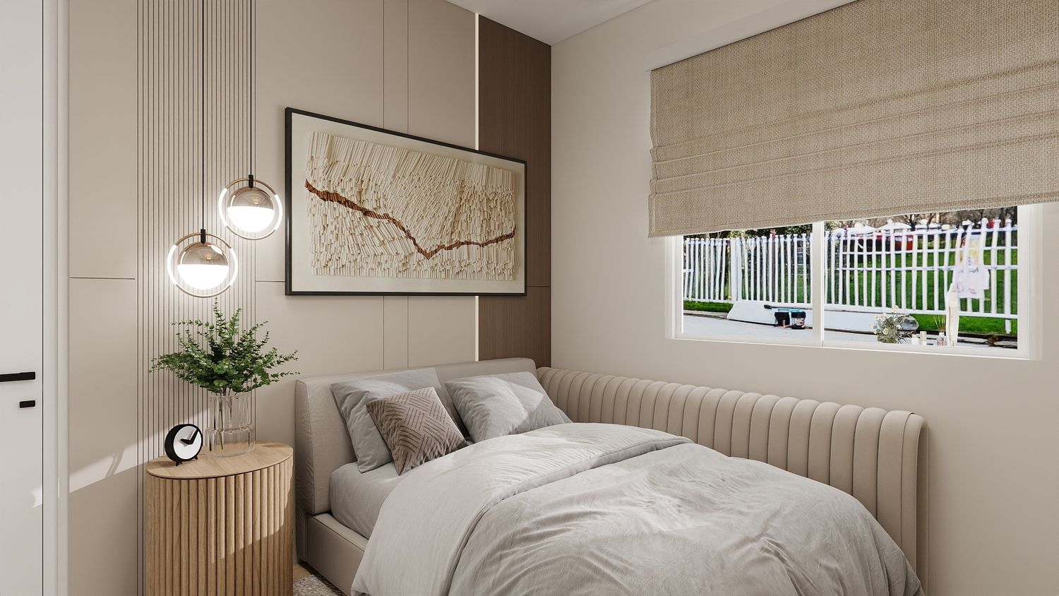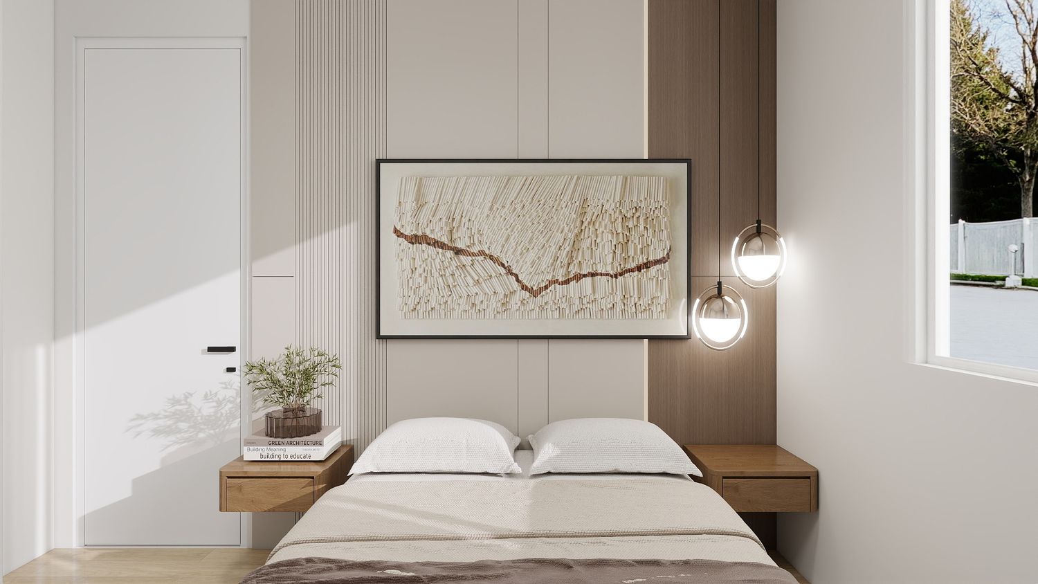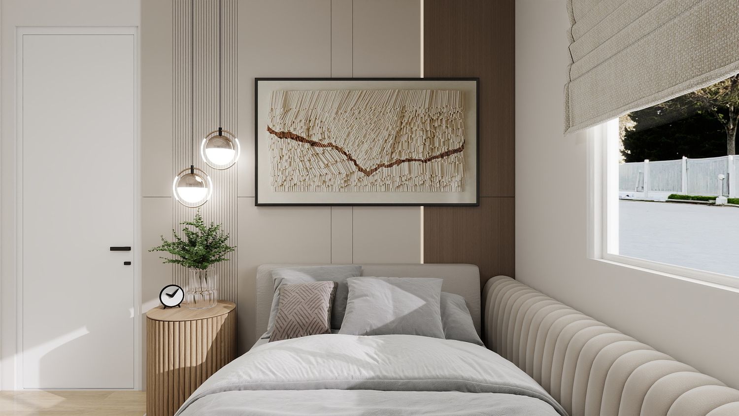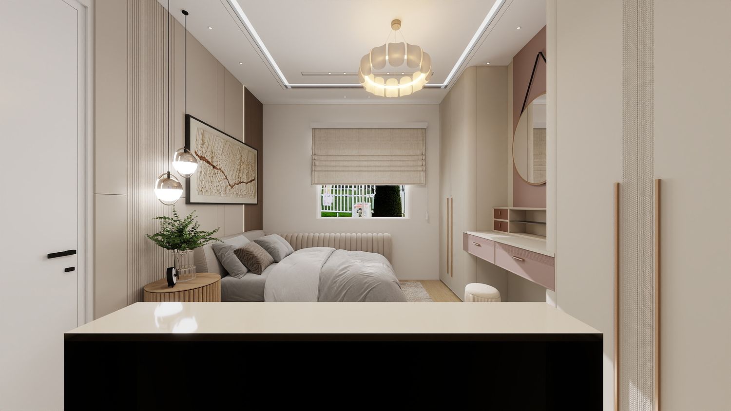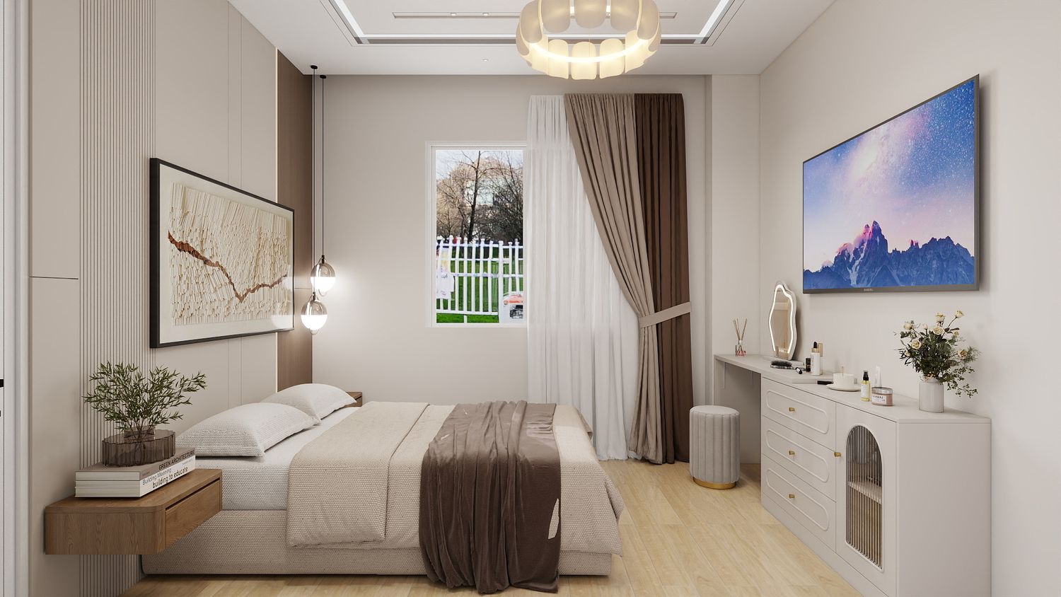 Opposite the bed, I designed a TV wall combined with a dresser, creating a practical and organized focal point.