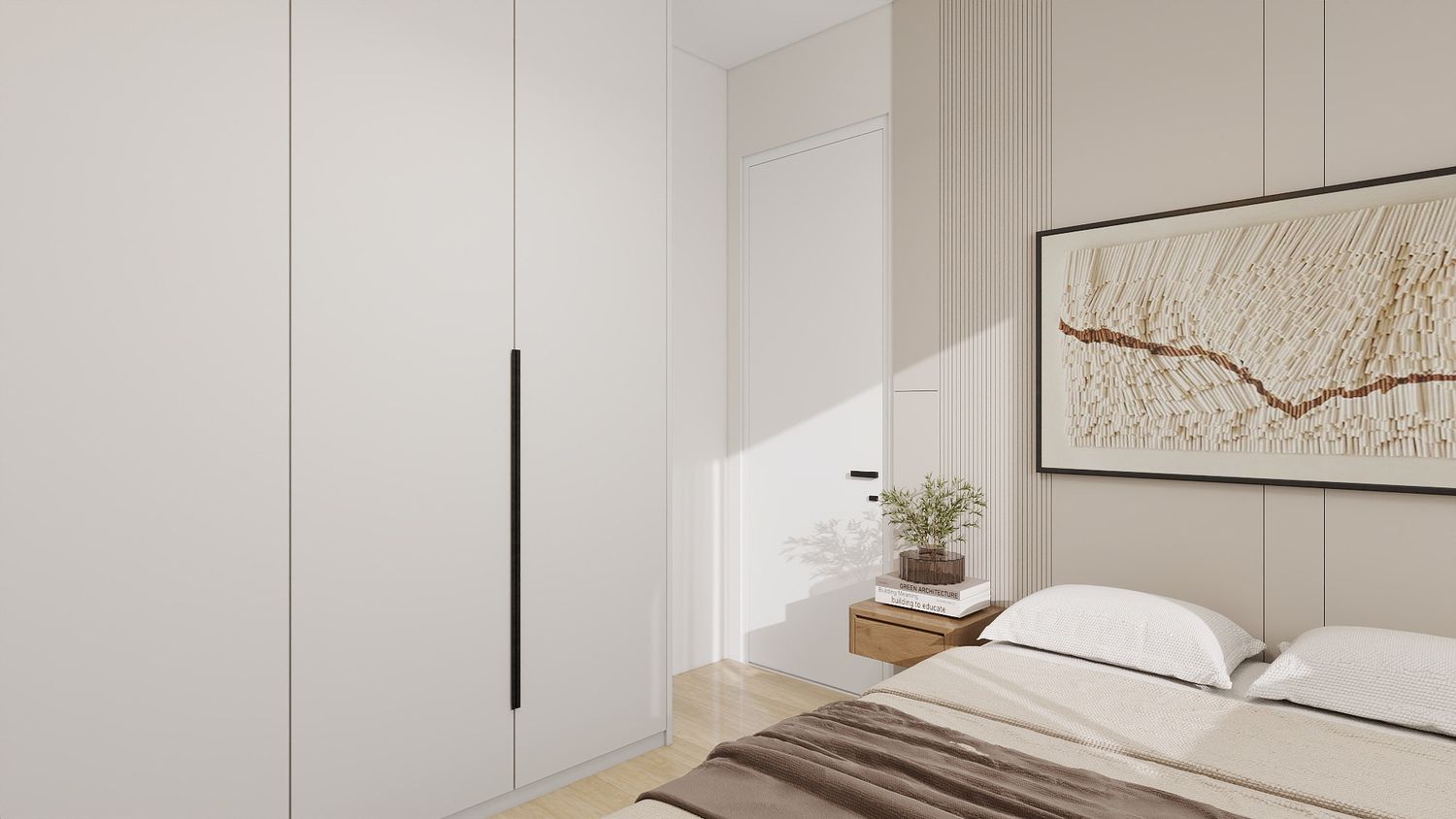 The wardrobe is placed opposite the bed, ensuring functional storage without interrupting movement.