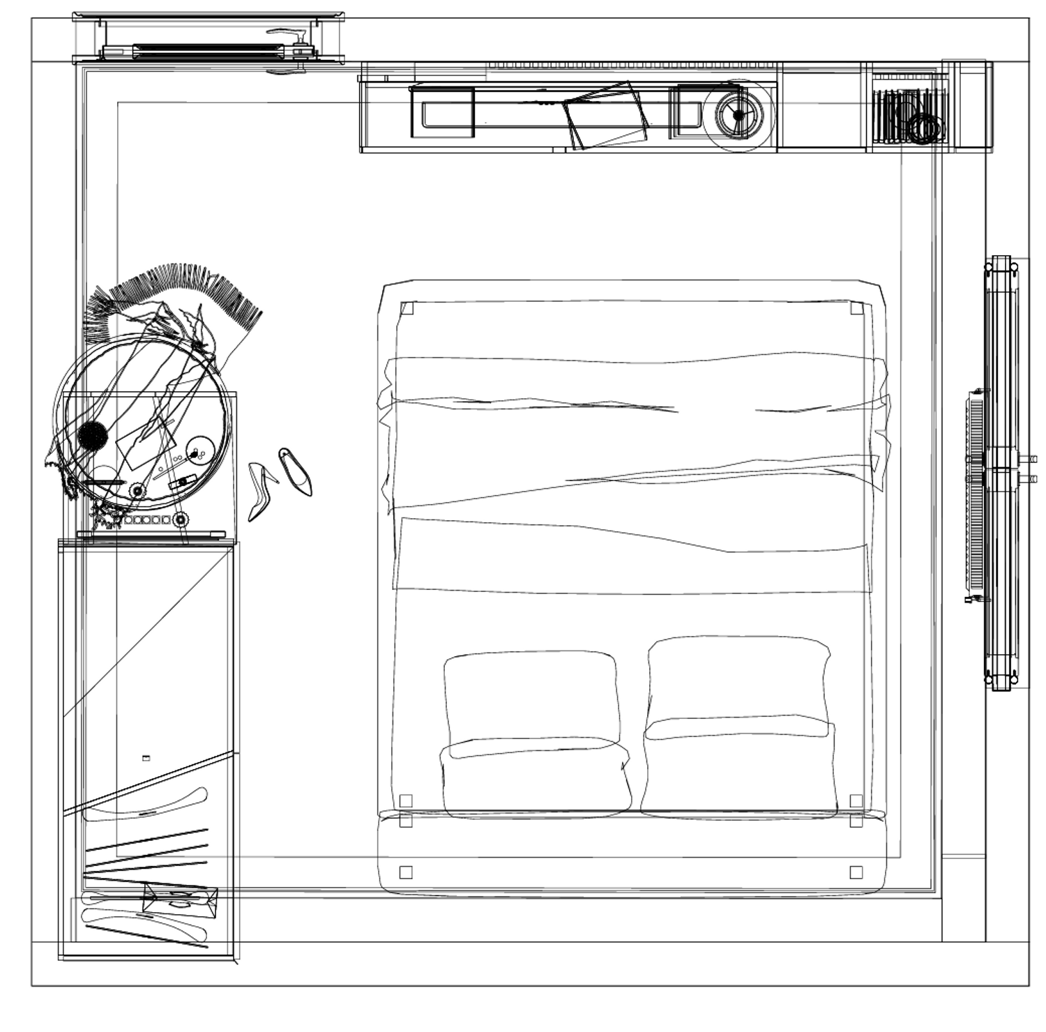 - The room is compact yet efficiently planned, with a clear and balanced furniture arrangement.
