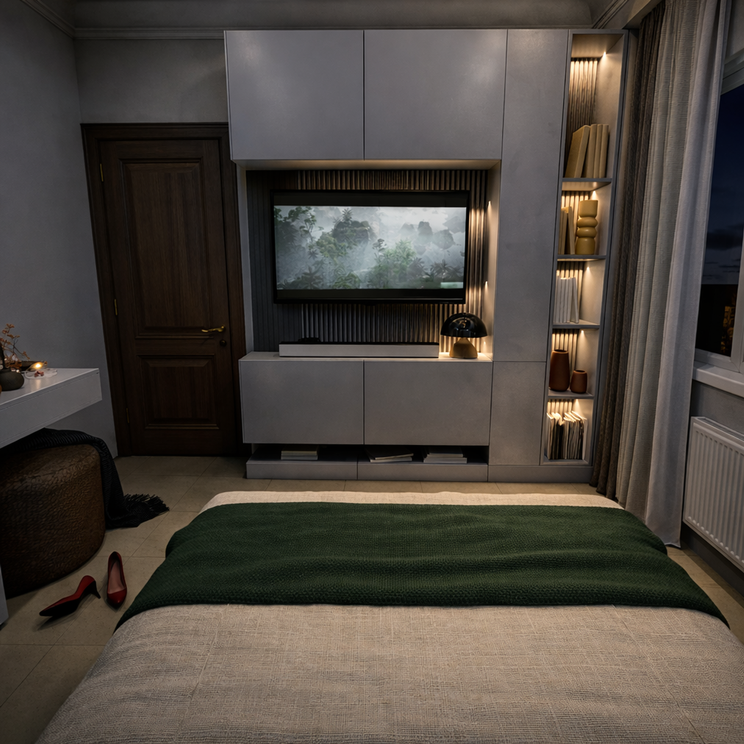 -The wall opposite the bed is designed as a full-height integrated unit combining TV, storage, and display shelves, reducing the need for additional furniture and maintaining visual clarity.