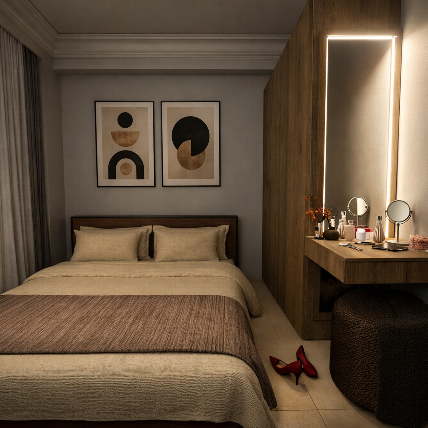 - A built-in vanity seamlessly connected to the wardrobe features a backlit mirror, adding a sense of luxury while visually expanding the room.